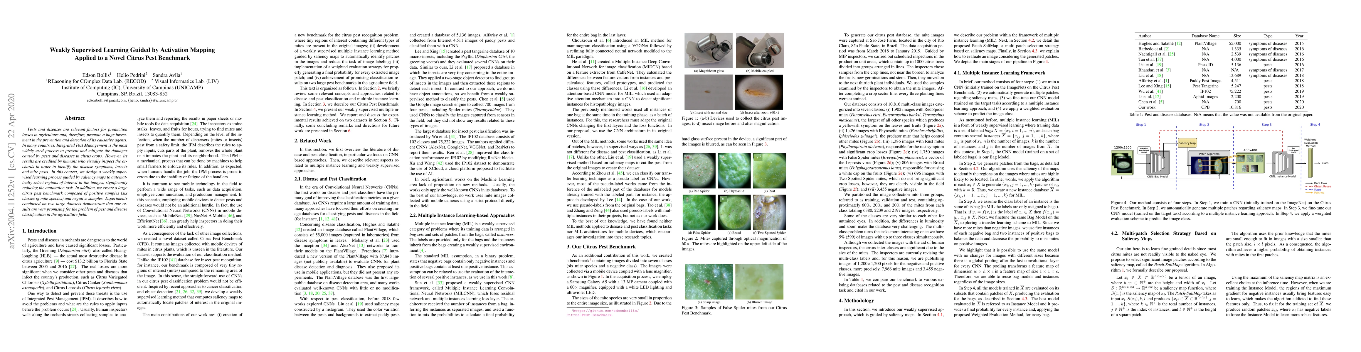 Pests and diseases are relevant factors for production losses in agriculture and, therefore, promote a huge investment in the prevention and detection of its causative agents. In many countries, Integrated Pest Management is the most widely used process to prevent and mitigate the damages caused by pests and diseases in citrus crops. However, its results are credited by humans who visually inspect the orchards in order to identify the disease symptoms, insects and mite pests. In this context, we design a weakly supervised learning process guided by saliency maps to automatically select regions of interest in the images, significantly reducing the annotation task. In addition, we create a large citrus pest benchmark composed of positive samples (six classes of mite species) and negative samples. Experiments conducted on two large datasets demonstrate that our results are very promising for the problem of pest and disease classification in the agriculture field.