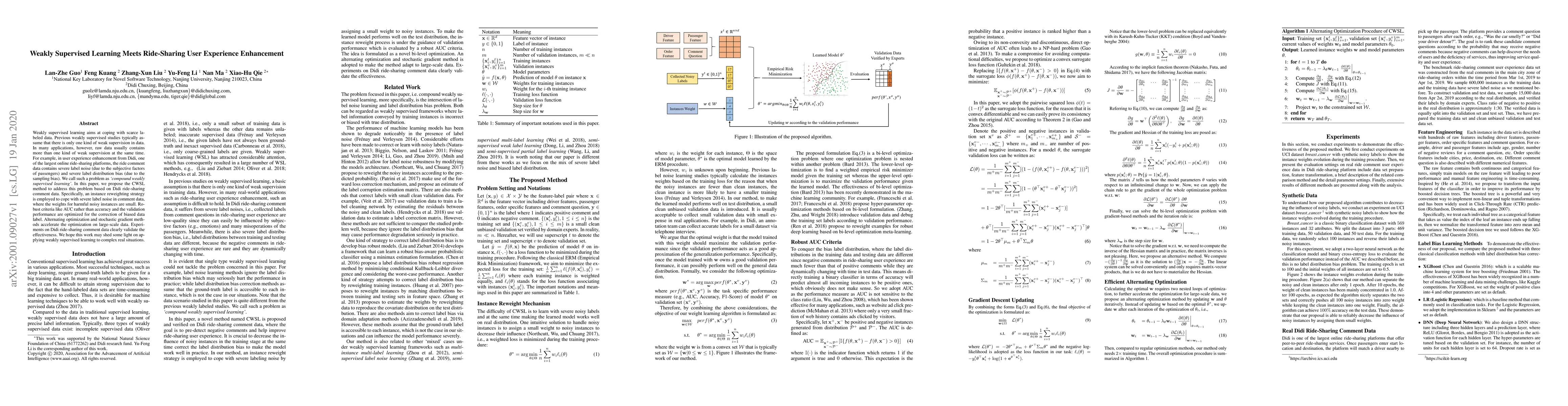 Weakly supervised learning aims at coping with scarce labeled data. Previous weakly supervised studies typically assume that there is only one kind of weak supervision in data. In many applications, however, raw data usually contains more than one kind of weak supervision at the same time. For example, in user experience enhancement from Didi, one of the largest online ride-sharing platforms, the ride comment data contains severe label noise (due to the subjective factors of passengers) and severe label distribution bias (due to the sampling bias). We call such a problem as "compound weakly supervised learning". In this paper, we propose the CWSL method to address this problem based on Didi ride-sharing comment data. Specifically, an instance reweighting strategy is employed to cope with severe label noise in comment data, where the weights for harmful noisy instances are small. Robust criteria like AUC rather than accuracy and the validation performance are optimized for the correction of biased data label. Alternating optimization and stochastic gradient methods accelerate the optimization on large-scale data. Experiments on Didi ride-sharing comment data clearly validate the effectiveness. We hope this work may shed some light on applying weakly supervised learning to complex real situations.