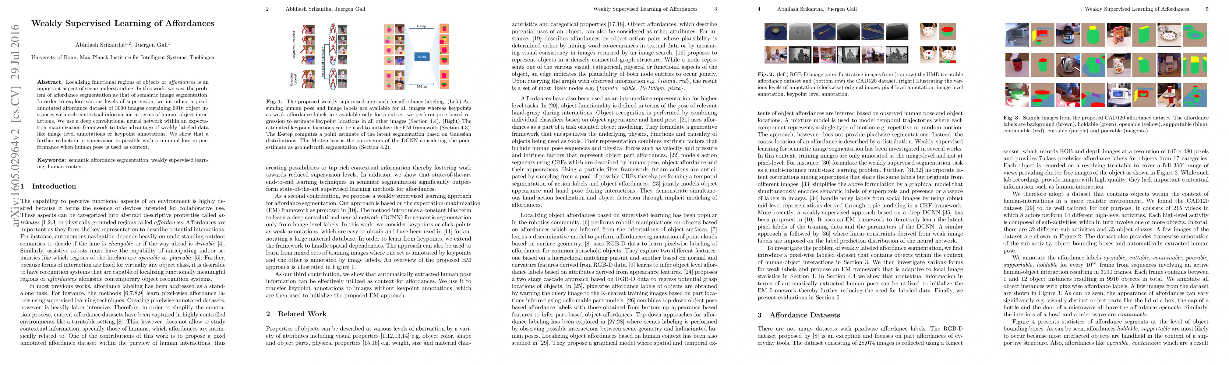 Localizing functional regions of objects or affordances is an important aspect of scene understanding. In this work, we cast the problem of affordance segmentation as that of semantic image segmentation. In order to explore various levels of supervision, we introduce a pixel-annotated affordance dataset of 3090 images containing 9916 object instances with rich contextual information in terms of human-object interactions. We use a deep convolutional neural network within an expectation maximization framework to take advantage of weakly labeled data like image level annotations or keypoint annotations. We show that a further reduction in supervision is possible with a minimal loss in performance when human pose is used as context.