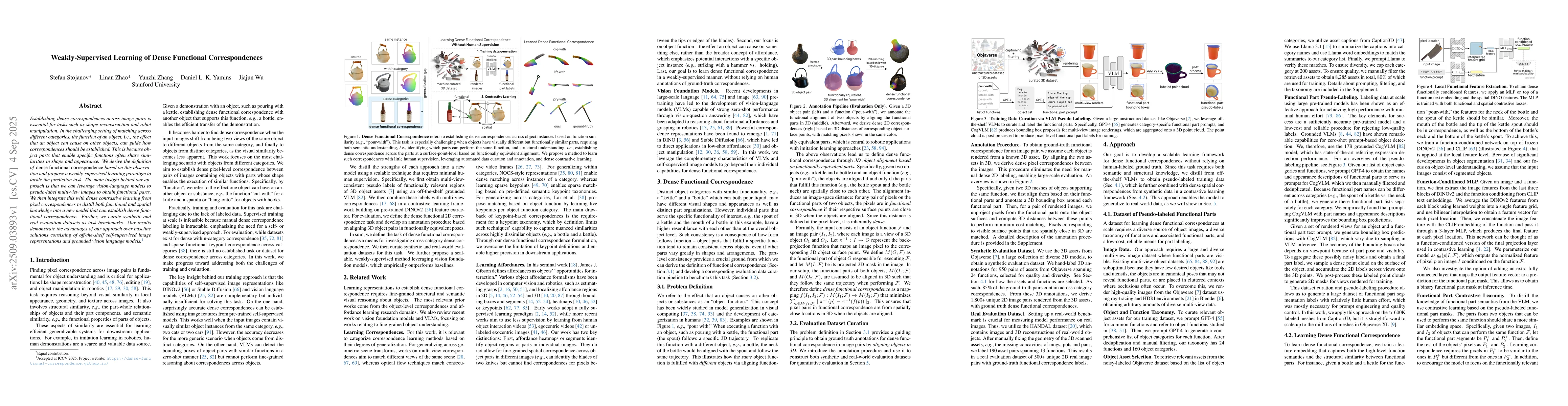 Establishing dense correspondences across image pairs is essential for tasks such as shape reconstruction and robot manipulation. In the challenging setting of matching across different categories, the function of an object, i.e., the effect that an object can cause on other objects, can guide how correspondences should be established. This is because object parts that enable specific functions often share similarities in shape and appearance. We derive the definition of dense functional correspondence based on this observation and propose a weakly-supervised learning paradigm to tackle the prediction task. The main insight behind our approach is that we can leverage vision-language models to pseudo-label multi-view images to obtain functional parts. We then integrate this with dense contrastive learning from pixel correspondences to distill both functional and spatial knowledge into a new model that can establish dense functional correspondence. Further, we curate synthetic and real evaluation datasets as task benchmarks. Our results demonstrate the advantages of our approach over baseline solutions consisting of off-the-shelf self-supervised image representations and grounded vision language models.