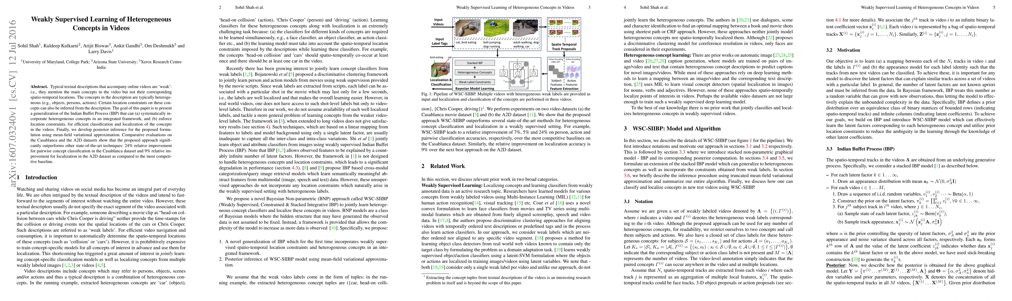 Typical textual descriptions that accompany online videos are 'weak': i.e., they mention the main concepts in the video but not their corresponding spatio-temporal locations. The concepts in the description are typically heterogeneous (e.g., objects, persons, actions). Certain location constraints on these concepts can also be inferred from the description. The goal of this paper is to present a generalization of the Indian Buffet Process (IBP) that can (a) systematically incorporate heterogeneous concepts in an integrated framework, and (b) enforce location constraints, for efficient classification and localization of the concepts in the videos. Finally, we develop posterior inference for the proposed formulation using mean-field variational approximation. Comparative evaluations on the Casablanca and the A2D datasets show that the proposed approach significantly outperforms other state-of-the-art techniques: 24% relative improvement for pairwise concept classification in the Casablanca dataset and 9% relative improvement for localization in the A2D dataset as compared to the most competitive baseline.