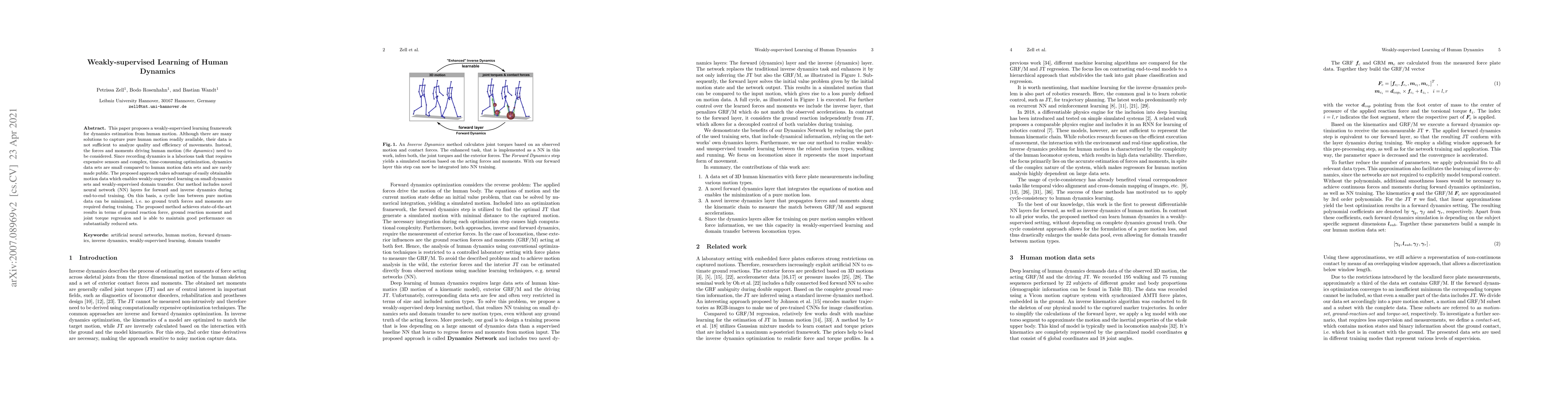 This paper proposes a weakly-supervised learning framework for dynamics estimation from human motion. Although there are many solutions to capture pure human motion readily available, their data is not sufficient to analyze quality and efficiency of movements. Instead, the forces and moments driving human motion (the dynamics) need to be considered. Since recording dynamics is a laborious task that requires expensive sensors and complex, time-consuming optimization, dynamics data sets are small compared to human motion data sets and are rarely made public. The proposed approach takes advantage of easily obtainable motion data which enables weakly-supervised learning on small dynamics sets and weakly-supervised domain transfer. Our method includes novel neural network (NN) layers for forward and inverse dynamics during end-to-end training. On this basis, a cyclic loss between pure motion data can be minimized, i.e. no ground truth forces and moments are required during training. The proposed method achieves state-of-the-art results in terms of ground reaction force, ground reaction moment and joint torque regression and is able to maintain good performance on substantially reduced sets.