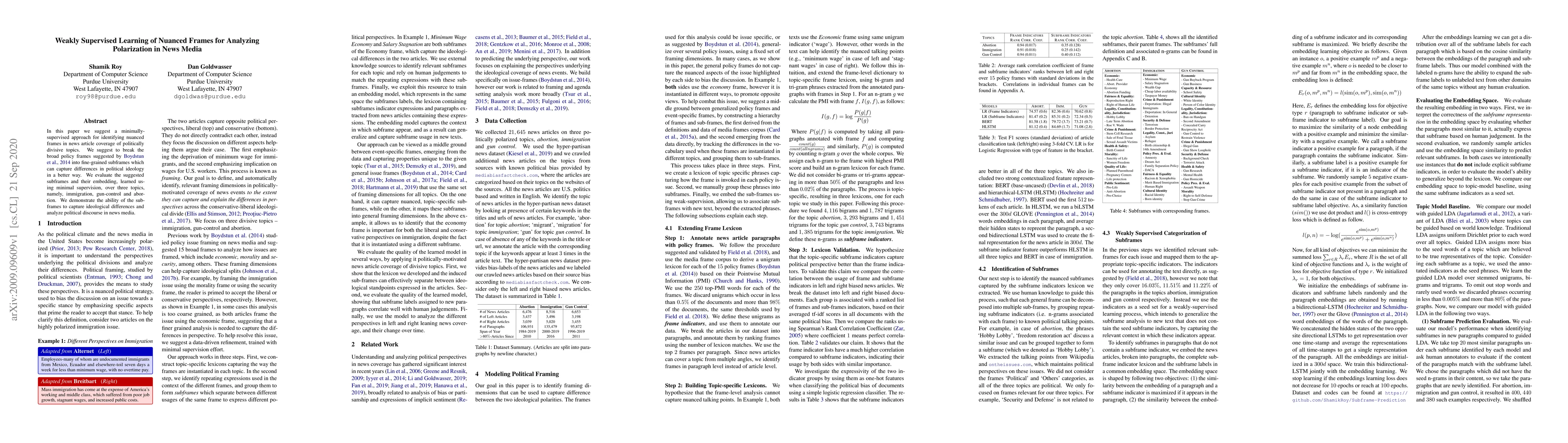 In this paper we suggest a minimally-supervised approach for identifying nuanced frames in news article coverage of politically divisive topics. We suggest to break the broad policy frames suggested by Boydstun et al., 2014 into fine-grained subframes which can capture differences in political ideology in a better way. We evaluate the suggested subframes and their embedding, learned using minimal supervision, over three topics, namely, immigration, gun-control and abortion. We demonstrate the ability of the subframes to capture ideological differences and analyze political discourse in news media.
