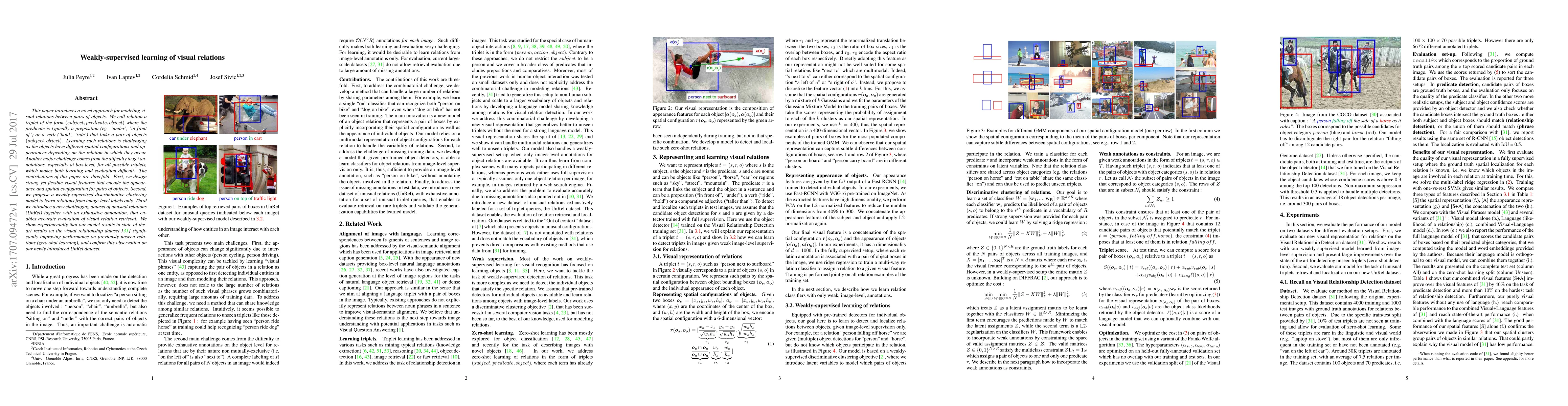 This paper introduces a novel approach for modeling visual relations between pairs of objects. We call relation a triplet of the form (subject, predicate, object) where the predicate is typically a preposition (eg. 'under', 'in front of') or a verb ('hold', 'ride') that links a pair of objects (subject, object). Learning such relations is challenging as the objects have different spatial configurations and appearances depending on the relation in which they occur. Another major challenge comes from the difficulty to get annotations, especially at box-level, for all possible triplets, which makes both learning and evaluation difficult. The contributions of this paper are threefold. First, we design strong yet flexible visual features that encode the appearance and spatial configuration for pairs of objects. Second, we propose a weakly-supervised discriminative clustering model to learn relations from image-level labels only. Third we introduce a new challenging dataset of unusual relations (UnRel) together with an exhaustive annotation, that enables accurate evaluation of visual relation retrieval. We show experimentally that our model results in state-of-the-art results on the visual relationship dataset significantly improving performance on previously unseen relations (zero-shot learning), and confirm this observation on our newly introduced UnRel dataset.