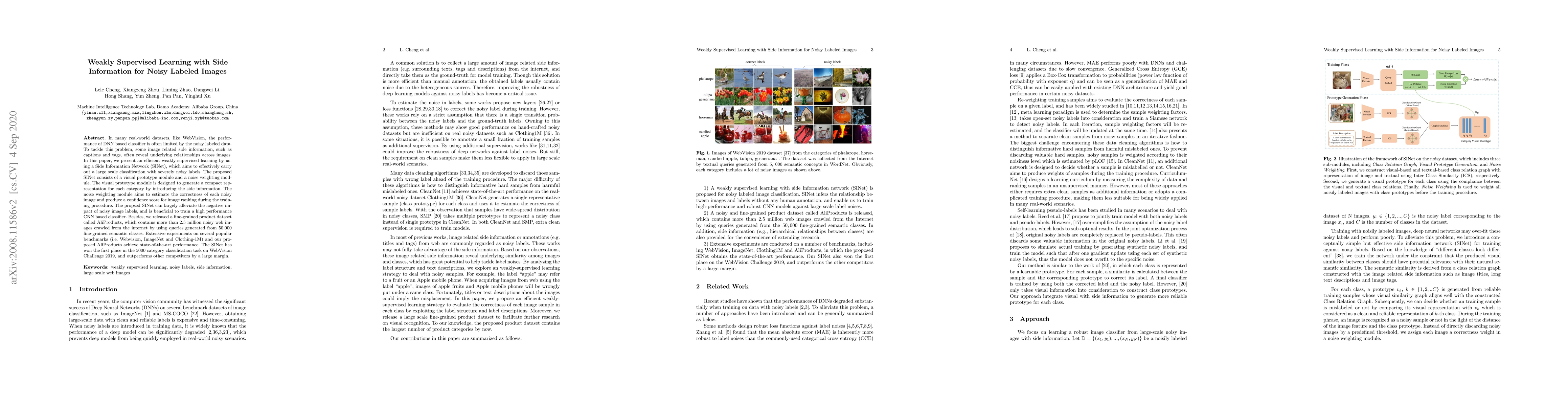 In many real-world datasets, like WebVision, the performance of DNN based classifier is often limited by the noisy labeled data. To tackle this problem, some image related side information, such as captions and tags, often reveal underlying relationships across images. In this paper, we present an efficient weakly supervised learning by using a Side Information Network (SINet), which aims to effectively carry out a large scale classification with severely noisy labels. The proposed SINet consists of a visual prototype module and a noise weighting module. The visual prototype module is designed to generate a compact representation for each category by introducing the side information. The noise weighting module aims to estimate the correctness of each noisy image and produce a confidence score for image ranking during the training procedure. The propsed SINet can largely alleviate the negative impact of noisy image labels, and is beneficial to train a high performance CNN based classifier. Besides, we released a fine-grained product dataset called AliProducts, which contains more than 2.5 million noisy web images crawled from the internet by using queries generated from 50,000 fine-grained semantic classes. Extensive experiments on several popular benchmarks (i.e. Webvision, ImageNet and Clothing-1M) and our proposed AliProducts achieve state-of-the-art performance. The SINet has won the first place in the classification task on WebVision Challenge 2019, and outperformed other competitors by a large margin.