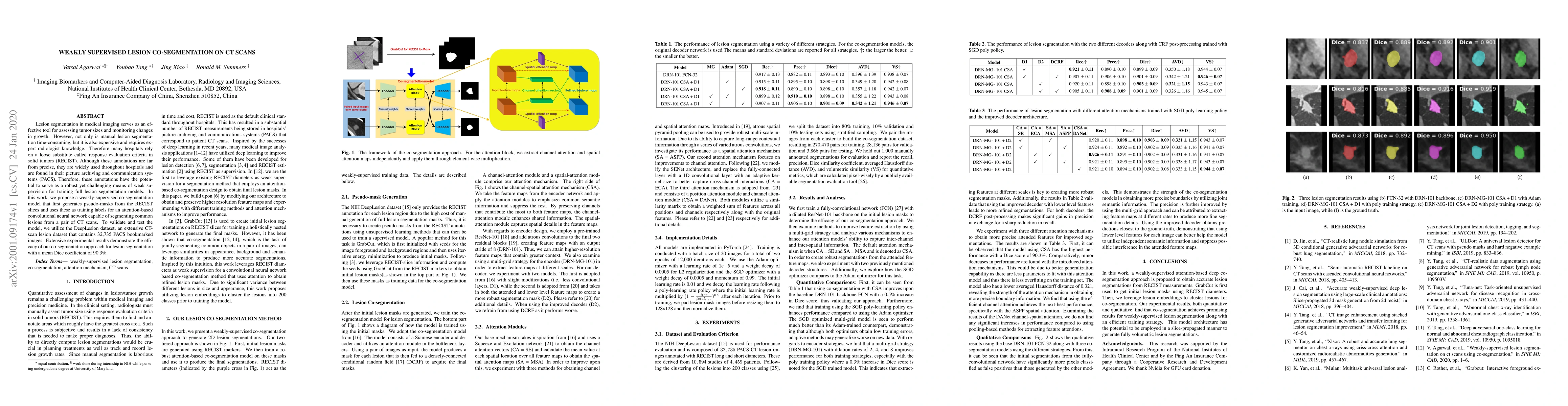 This paper proposes a weakly-supervised co-segmentation model for lesion segmentation on CT scans using RECIST annotations as weak supervision. The model generates pseudo-masks from RECIST annotations and trains an attention-based CNN, achieving a mean Dice coefficient of 90.3% on the DeepLesion dataset.