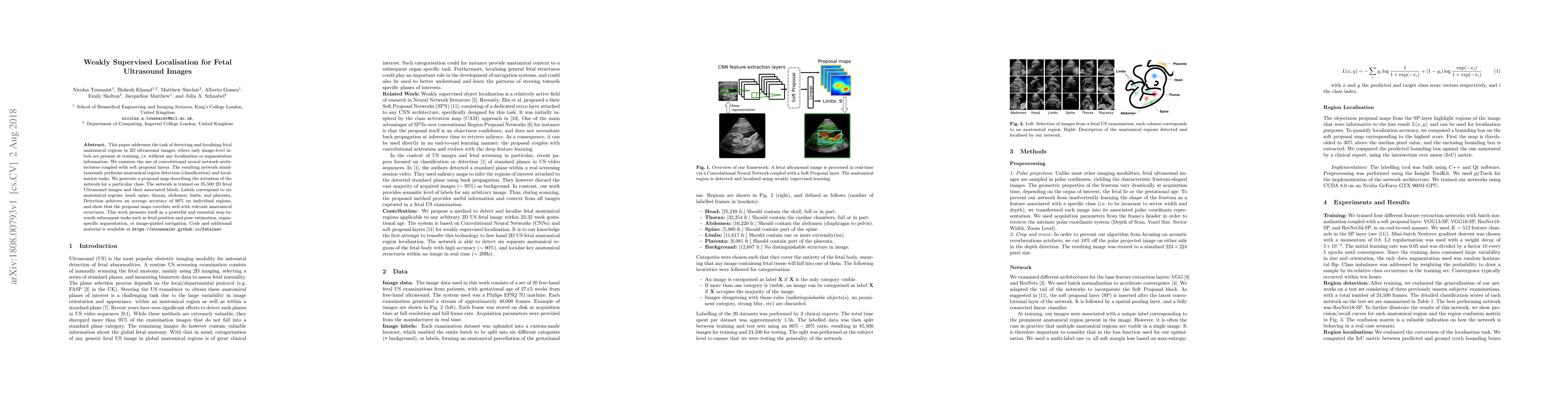 This paper addresses the task of detecting and localising fetal anatomical regions in 2D ultrasound images, where only image-level labels are present at training, i.e. without any localisation or segmentation information. We examine the use of convolutional neural network architectures coupled with soft proposal layers. The resulting network simultaneously performs anatomical region detection (classification) and localisation tasks. We generate a proposal map describing the attention of the network for a particular class. The network is trained on 85,500 2D fetal Ultrasound images and their associated labels. Labels correspond to six anatomical regions: head, spine, thorax, abdomen, limbs, and placenta. Detection achieves an average accuracy of 90\% on individual regions, and show that the proposal maps correlate well with relevant anatomical structures. This work presents itself as a powerful and essential step towards subsequent tasks such as fetal position and pose estimation, organ-specific segmentation, or image-guided navigation. Code and additional material is available at https://ntoussaint.github.io/fetalnav