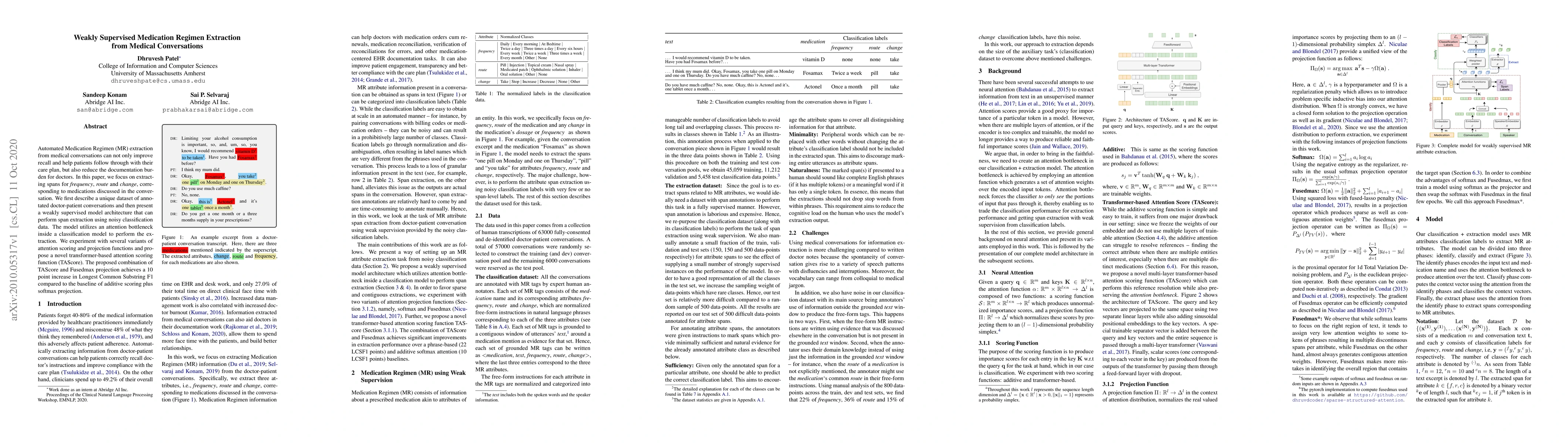 This paper presents a weakly supervised model for extracting medication regimens from medical conversations, focusing on frequency, route, and change spans. The model uses a novel transformer-based attention scoring function (TAScore) combined with Fusedmax projection, achieving a 10-point improvement in F1 score compared to the baseline.
