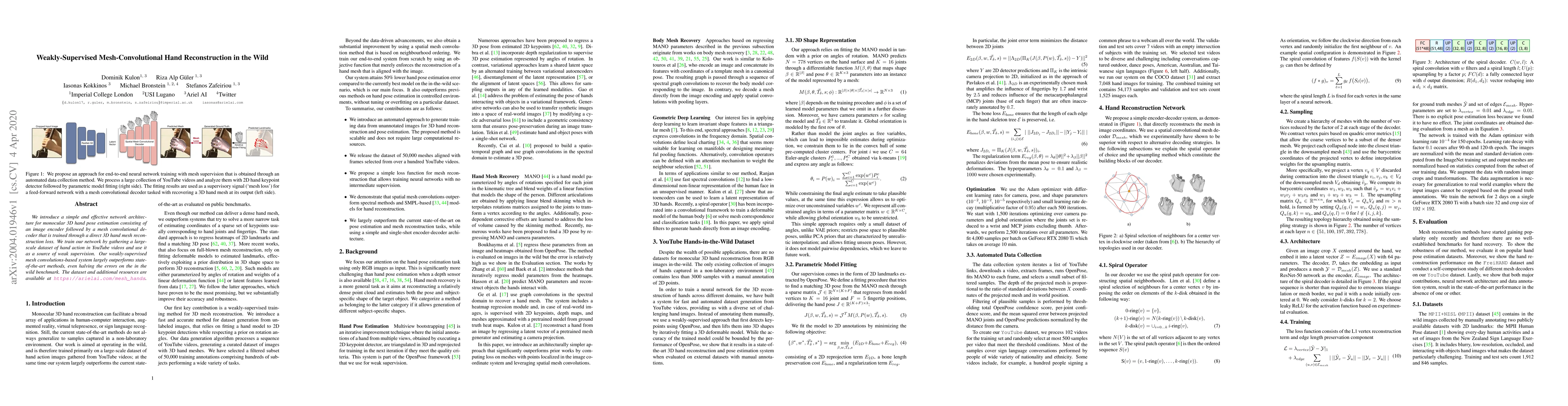 We introduce a simple and effective network architecture for monocular 3D hand pose estimation consisting of an image encoder followed by a mesh convolutional decoder that is trained through a direct 3D hand mesh reconstruction loss. We train our network by gathering a large-scale dataset of hand action in YouTube videos and use it as a source of weak supervision. Our weakly-supervised mesh convolutions-based system largely outperforms state-of-the-art methods, even halving the errors on the in the wild benchmark. The dataset and additional resources are available at https://arielai.com/mesh_hands.