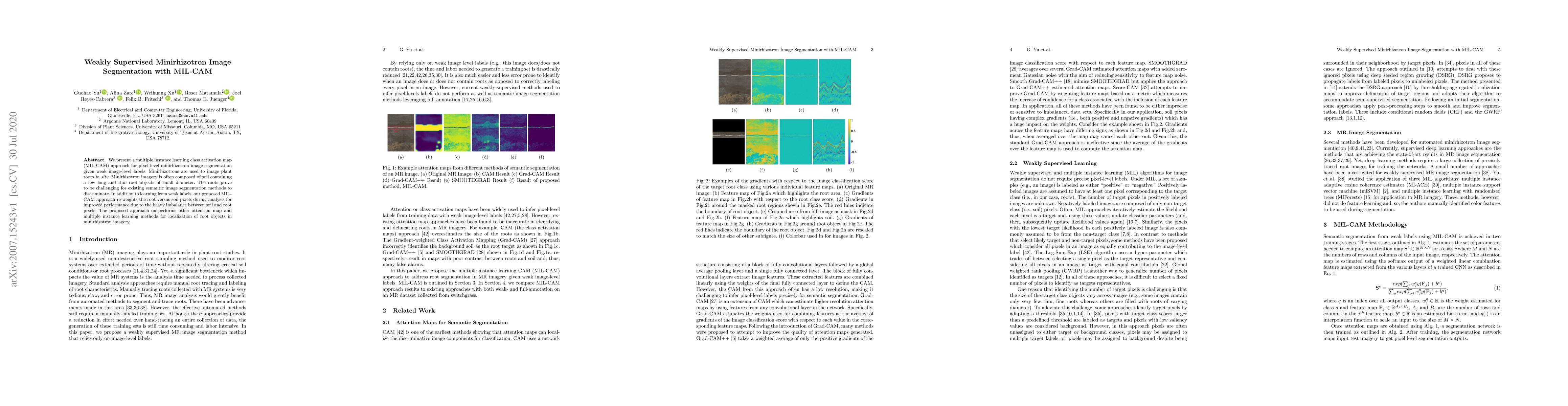 We present a multiple instance learning class activation map (MIL-CAM) approach for pixel-level minirhizotron image segmentation given weak image-level labels. Minirhizotrons are used to image plant roots in situ. Minirhizotron imagery is often composed of soil containing a few long and thin root objects of small diameter. The roots prove to be challenging for existing semantic image segmentation methods to discriminate. In addition to learning from weak labels, our proposed MIL-CAM approach re-weights the root versus soil pixels during analysis for improved performance due to the heavy imbalance between soil and root pixels. The proposed approach outperforms other attention map and multiple instance learning methods for localization of root objects in minirhizotron imagery.