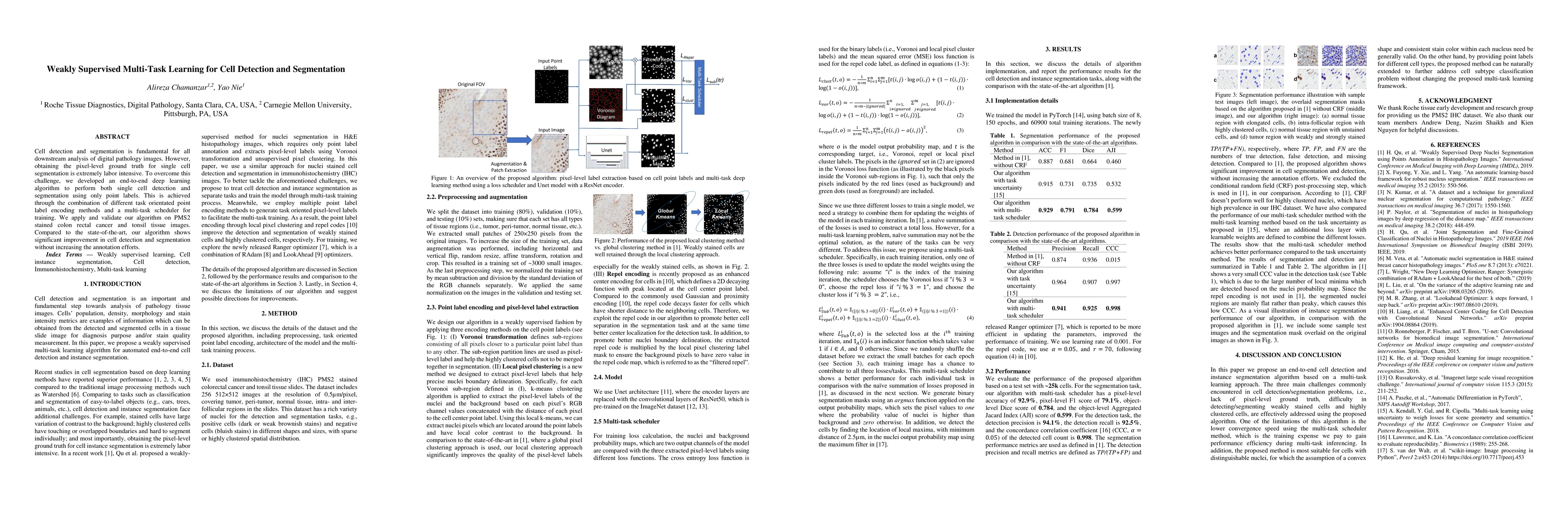 Cell detection and segmentation is fundamental for all downstream analysis of digital pathology images. However, obtaining the pixel-level ground truth for single cell segmentation is extremely labor intensive. To overcome this challenge, we developed an end-to-end deep learning algorithm to perform both single cell detection and segmentation using only point labels. This is achieved through the combination of different task orientated point label encoding methods and a multi-task scheduler for training. We apply and validate our algorithm on PMS2 stained colon rectal cancer and tonsil tissue images. Compared to the state-of-the-art, our algorithm shows significant improvement in cell detection and segmentation without increasing the annotation efforts.