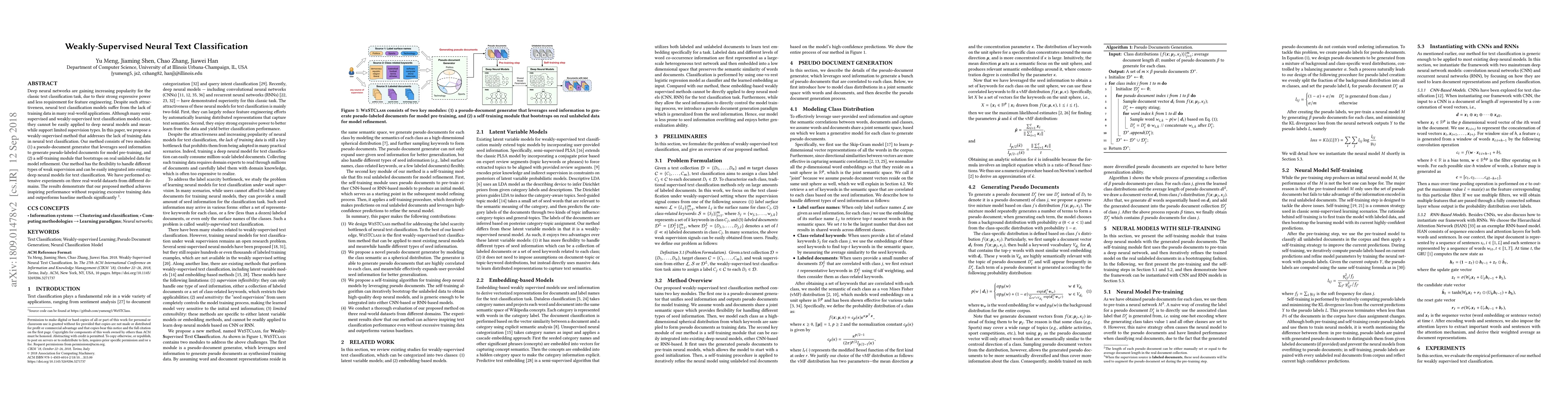This paper proposes a weakly-supervised method for neural text classification that tackles the issue of limited training data by using a pseudo-document generator and a self-training module. The method is flexible, handles various weak supervision types, and outperforms baselines on multiple datasets.