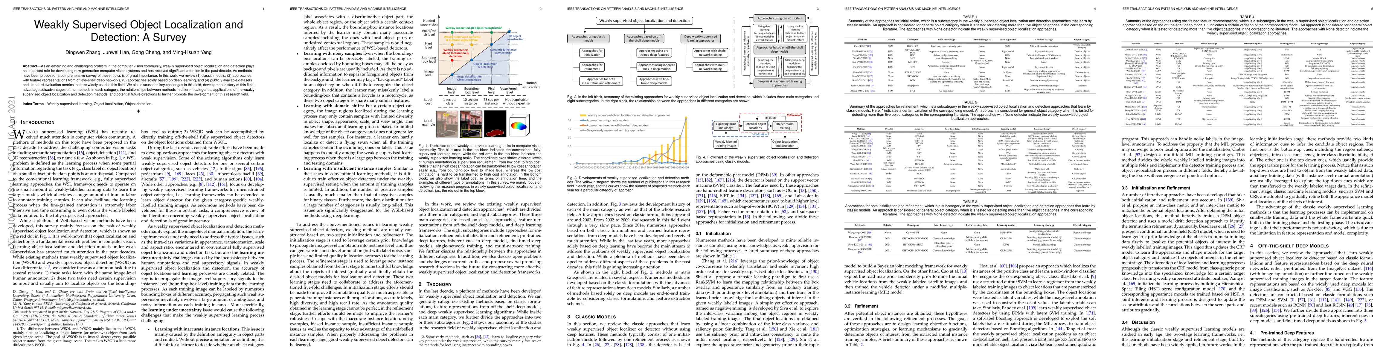 This paper surveys weakly supervised object localization and detection methods, categorizing them into classic models, deep learning-based approaches, and those utilizing pre-trained features. It also discusses datasets, evaluation metrics, challenges, and future directions in the field.