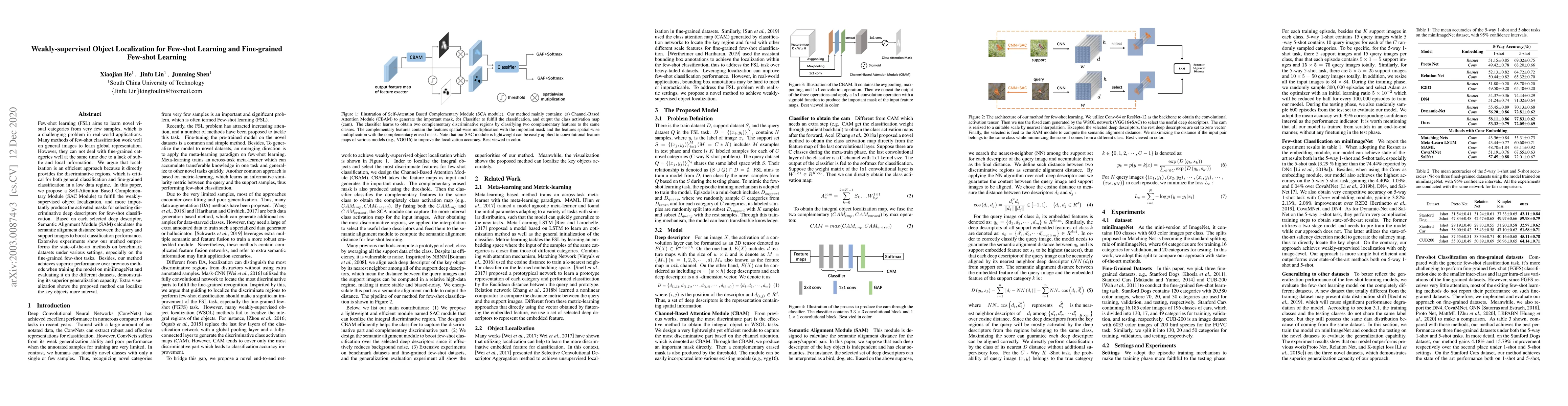 This paper proposes a Self-Attention Based Complementary Module (SAC Module) for weakly-supervised object localization to enhance few-shot learning, especially fine-grained classification. The method uses activated masks to select discriminative deep descriptors, and a Semantic Alignment Module (SAM) to improve classification accuracy, outperforming state-of-the-art methods on benchmark datasets.