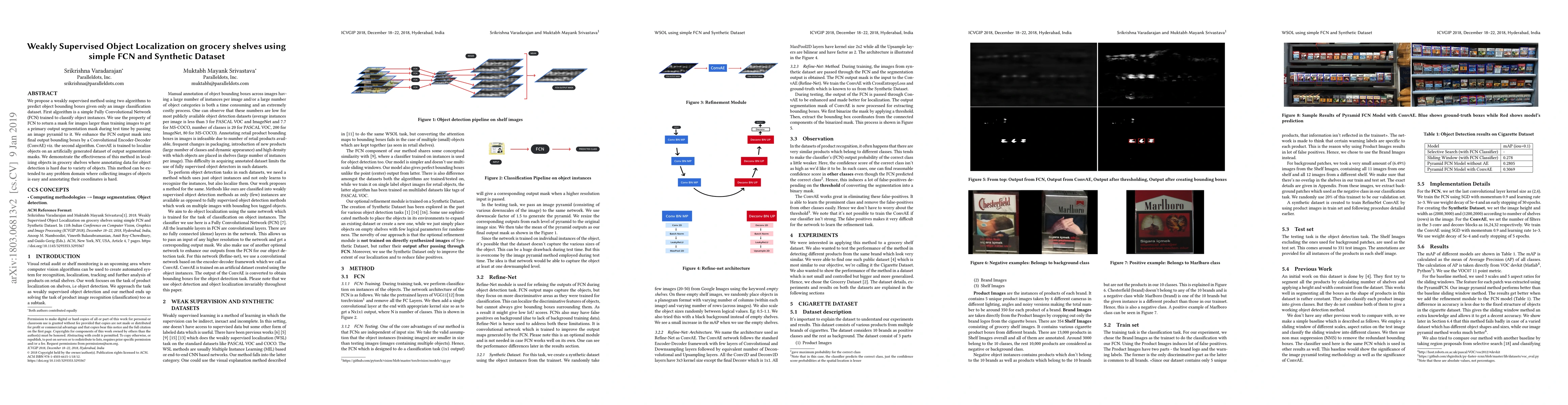 This paper proposes a weakly supervised method for object localization on grocery shelves using a simple Fully Convolutional Network (FCN) and a Convolutional Encoder-Decoder (ConvAE). The FCN generates initial segmentation masks, which are refined by ConvAE trained on synthetic data, demonstrating effective localization where detailed annotations are difficult to obtain.