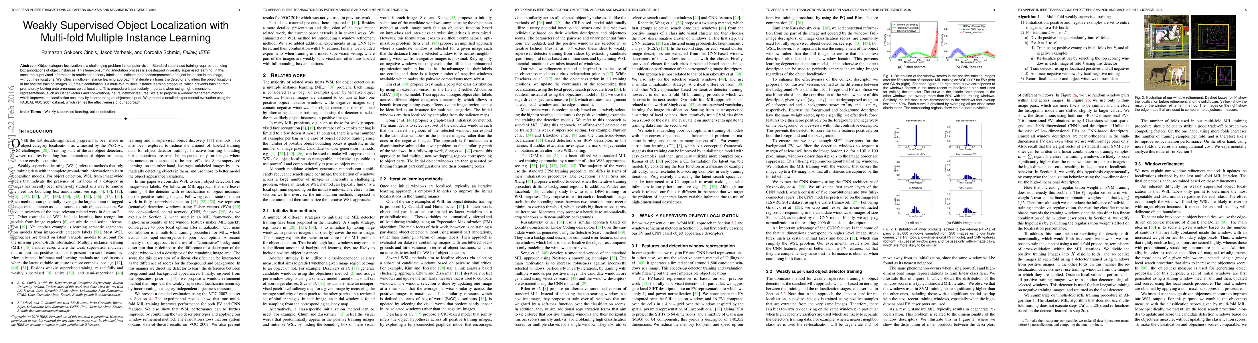 This paper proposes a weakly supervised object localization method using multi-fold multiple instance learning to avoid premature locking onto incorrect object locations. It also introduces a window refinement technique to enhance localization accuracy, validated through experiments on the PASCAL VOC 2007 dataset.