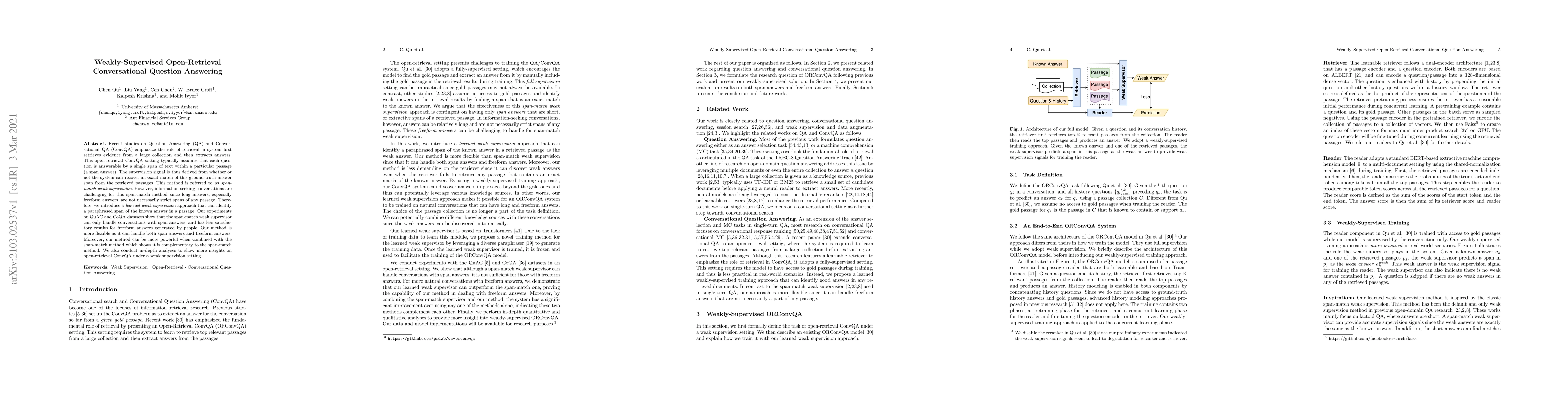 This paper introduces a learned weak supervision method for open-retrieval conversational question answering that identifies paraphrased spans of known answers, addressing the limitations of span-match weak supervision in handling freeform answers. Experiments show improved performance over span-match methods, especially for complex, freeform responses.