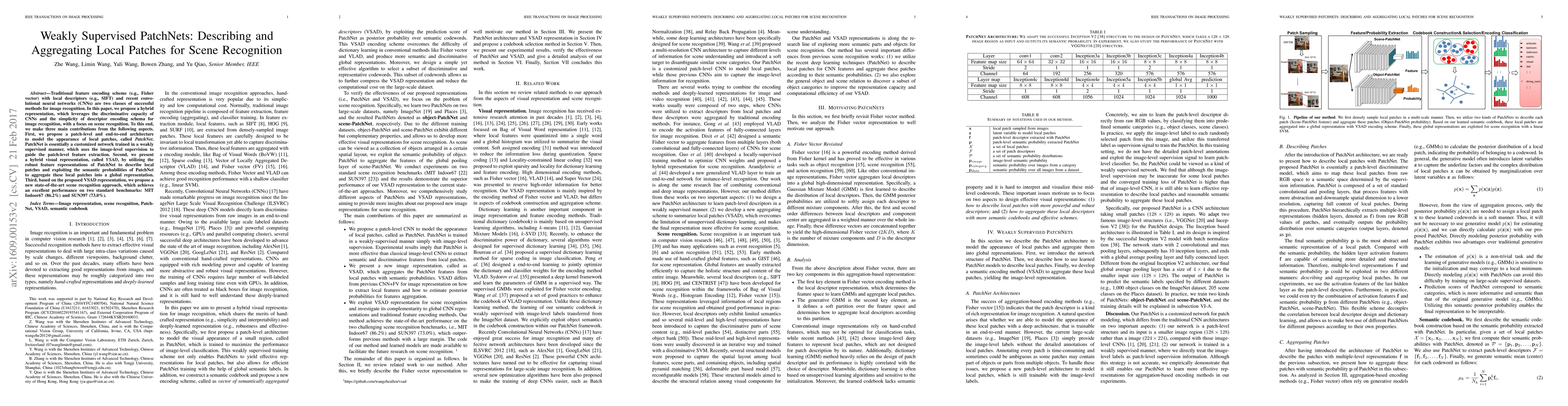 Traditional feature encoding scheme (e.g., Fisher vector) with local descriptors (e.g., SIFT) and recent convolutional neural networks (CNNs) are two classes of successful methods for image recognition. In this paper, we propose a hybrid representation, which leverages the discriminative capacity of CNNs and the simplicity of descriptor encoding schema for image recognition, with a focus on scene recognition. To this end, we make three main contributions from the following aspects. First, we propose a patch-level and end-to-end architecture to model the appearance of local patches, called {\em PatchNet}. PatchNet is essentially a customized network trained in a weakly supervised manner, which uses the image-level supervision to guide the patch-level feature extraction. Second, we present a hybrid visual representation, called {\em VSAD}, by utilizing the robust feature representations of PatchNet to describe local patches and exploiting the semantic probabilities of PatchNet to aggregate these local patches into a global representation. Third, based on the proposed VSAD representation, we propose a new state-of-the-art scene recognition approach, which achieves an excellent performance on two standard benchmarks: MIT Indoor67 (86.2\%) and SUN397 (73.0\%).