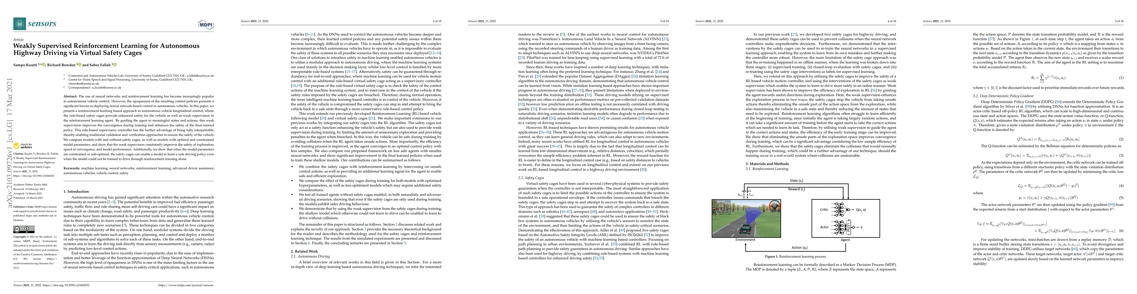 The use of neural networks and reinforcement learning has become increasingly popular in autonomous vehicle control. However, the opaqueness of the resulting control policies presents a significant barrier to deploying neural network-based control in autonomous vehicles. In this paper, we present a reinforcement learning based approach to autonomous vehicle longitudinal control, where the rule-based safety cages provide enhanced safety for the vehicle as well as weak supervision to the reinforcement learning agent. By guiding the agent to meaningful states and actions, this weak supervision improves the convergence during training and enhances the safety of the final trained policy. This rule-based supervisory controller has the further advantage of being fully interpretable, thereby enabling traditional validation and verification approaches to ensure the safety of the vehicle. We compare models with and without safety cages, as well as models with optimal and constrained model parameters, and show that the weak supervision consistently improves the safety of exploration, speed of convergence, and model performance. Additionally, we show that when the model parameters are constrained or sub-optimal, the safety cages can enable a model to learn a safe driving policy even when the model could not be trained to drive through reinforcement learning alone.