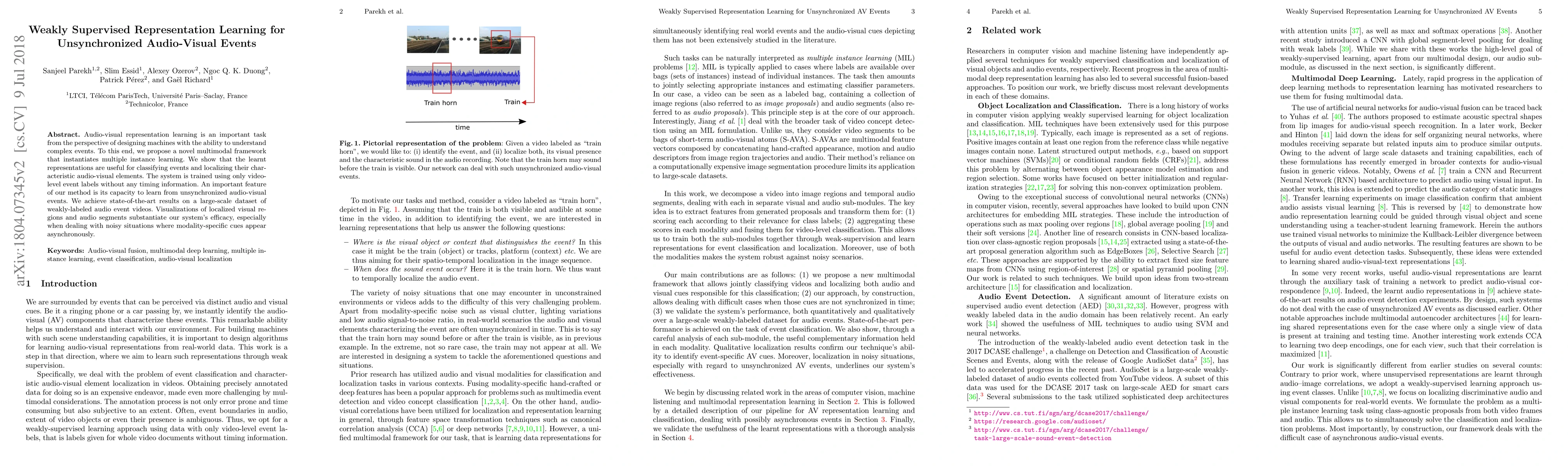This paper introduces a novel multimodal framework for weakly supervised representation learning of unsynchronized audio-visual events. The proposed method, utilizing multiple instance learning, achieves state-of-the-art results on weakly-labeled audio event videos without requiring synchronized event timings, demonstrating effective event classification and localization.