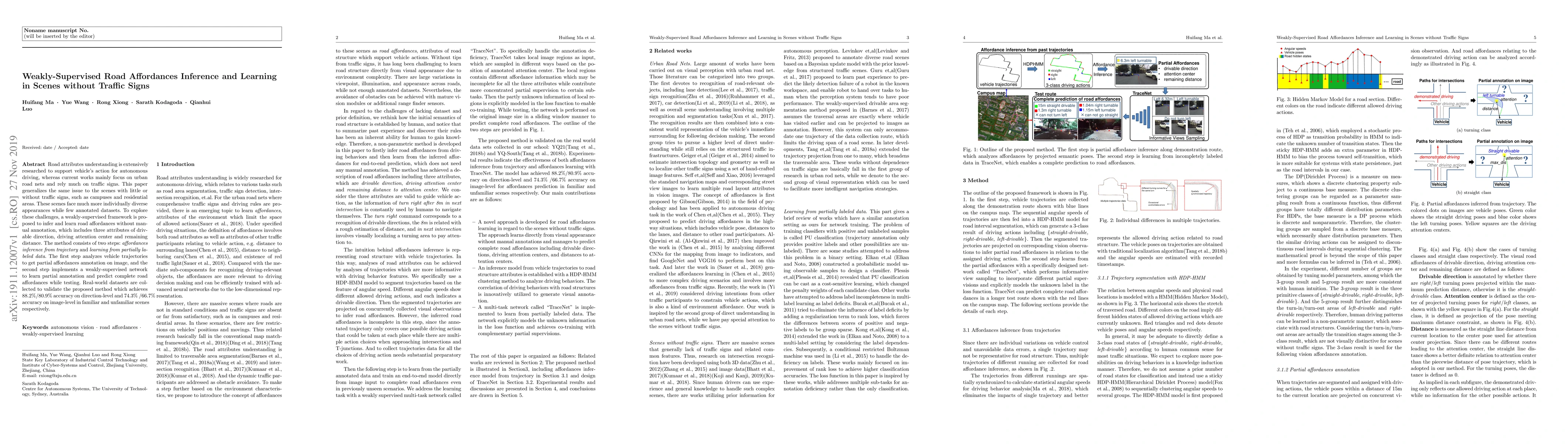 This paper proposes a weakly-supervised framework to infer and learn road affordances in scenes without traffic signs, focusing on drivable direction, driving attention center, and remaining distance. The method uses vehicle trajectories for partial annotation and a weakly-supervised network to predict complete road affordances, achieving high accuracy on real-world datasets.