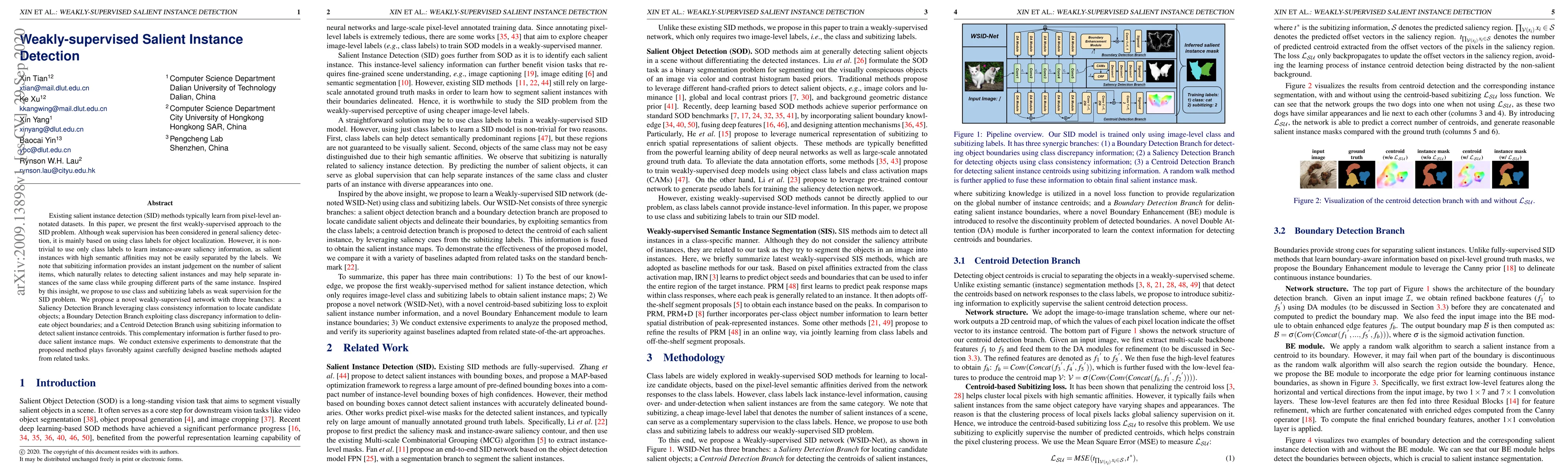 This paper introduces a novel weakly-supervised approach for salient instance detection (SID) using class and subitizing labels, proposing a network with three branches to leverage class consistency, boundary discrepancy, and centroid detection for instance separation. Experimental results show the method outperforms baselines adapted from related tasks.