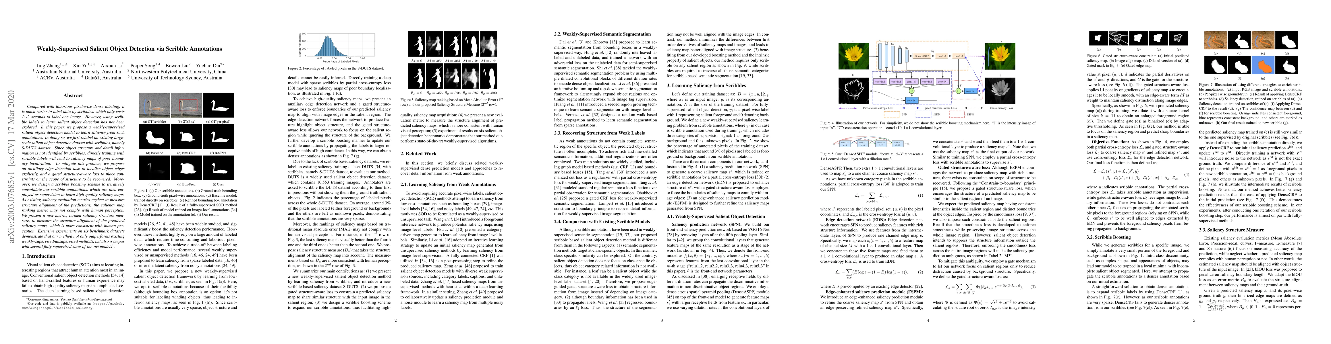 This paper presents a weakly-supervised salient object detection model trained using scribble annotations, which are easier and quicker to produce than dense pixel-wise labels. The method includes an auxiliary edge detection task and a structure-aware loss to improve boundary localization, along with a new metric for evaluating saliency map structure alignment. Experimental results show superior performance compared to existing weakly-supervised methods and competitive results with fully-supervised models.