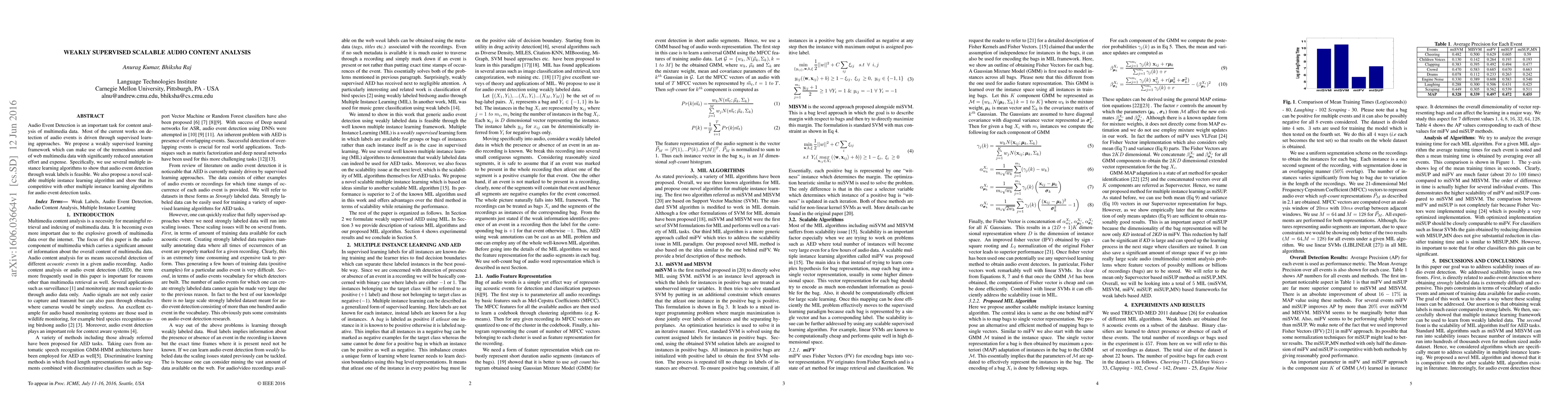 This paper proposes a weakly supervised learning framework for scalable audio content analysis using multiple instance learning algorithms, enabling efficient detection of audio events with minimal annotation effort. It introduces a novel scalable multiple instance learning algorithm that competes effectively with existing methods.