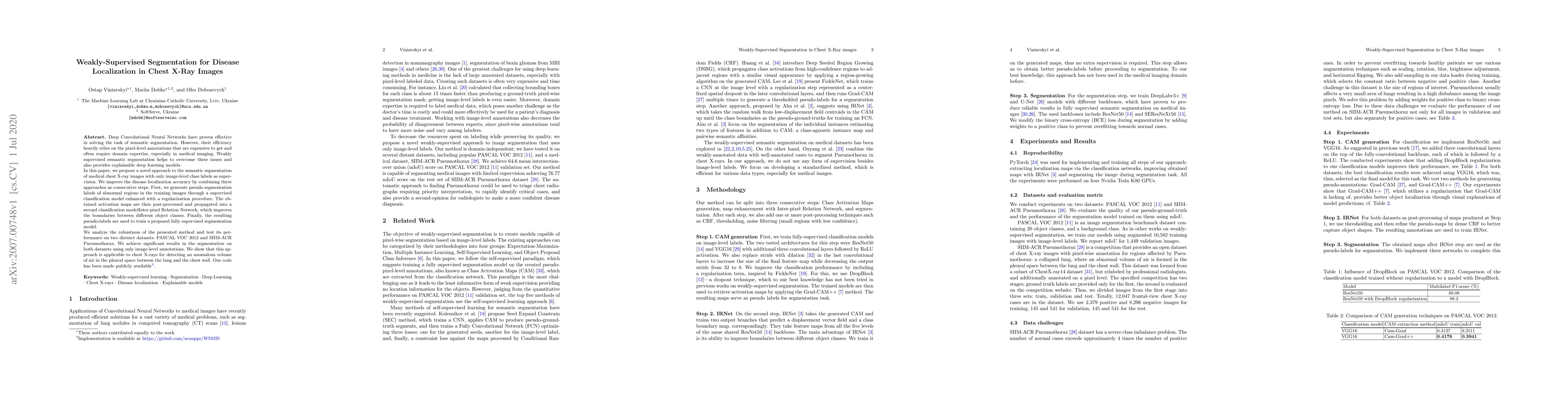 Deep Convolutional Neural Networks have proven effective in solving the task of semantic segmentation. However, their efficiency heavily relies on the pixel-level annotations that are expensive to get and often require domain expertise, especially in medical imaging. Weakly supervised semantic segmentation helps to overcome these issues and also provides explainable deep learning models. In this paper, we propose a novel approach to the semantic segmentation of medical chest X-ray images with only image-level class labels as supervision. We improve the disease localization accuracy by combining three approaches as consecutive steps. First, we generate pseudo segmentation labels of abnormal regions in the training images through a supervised classification model enhanced with a regularization procedure. The obtained activation maps are then post-processed and propagated into a second classification model-Inter-pixel Relation Network, which improves the boundaries between different object classes. Finally, the resulting pseudo-labels are used to train a proposed fully supervised segmentation model. We analyze the robustness of the presented method and test its performance on two distinct datasets: PASCAL VOC 2012 and SIIM-ACR Pneumothorax. We achieve significant results in the segmentation on both datasets using only image-level annotations. We show that this approach is applicable to chest X-rays for detecting an anomalous volume of air in the pleural space between the lung and the chest wall. Our code has been made publicly available.
