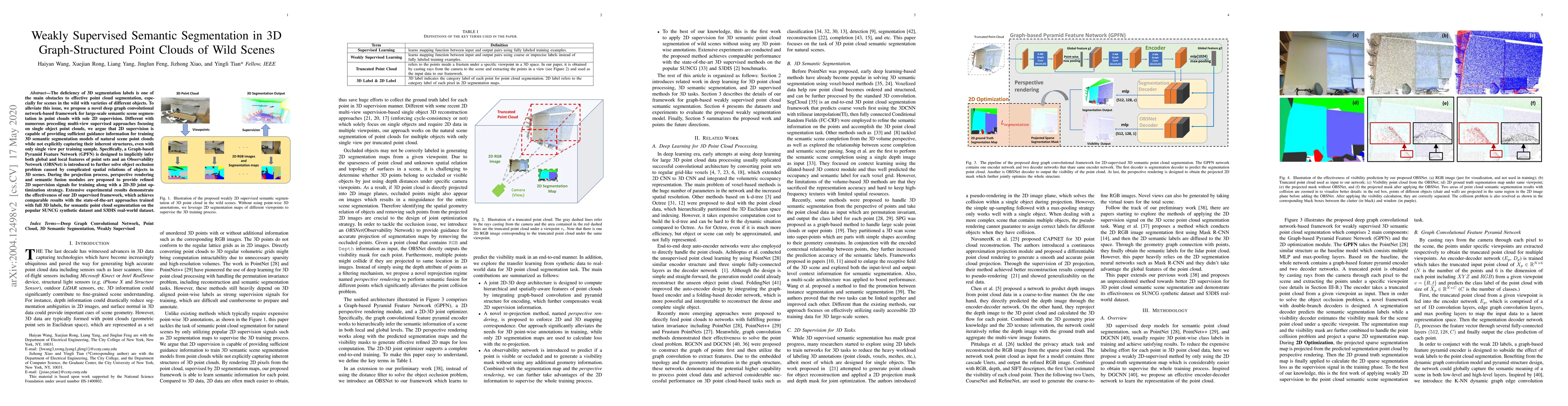 This paper introduces a novel deep graph convolutional network framework for weakly supervised semantic segmentation of 3D point clouds using only 2D supervision. The proposed Graph-based Pyramid Feature Network (GPFN) and Observability Network (OBSNet) infer global and local features and address object occlusions, achieving results comparable to fully supervised methods on synthetic and real-world datasets.