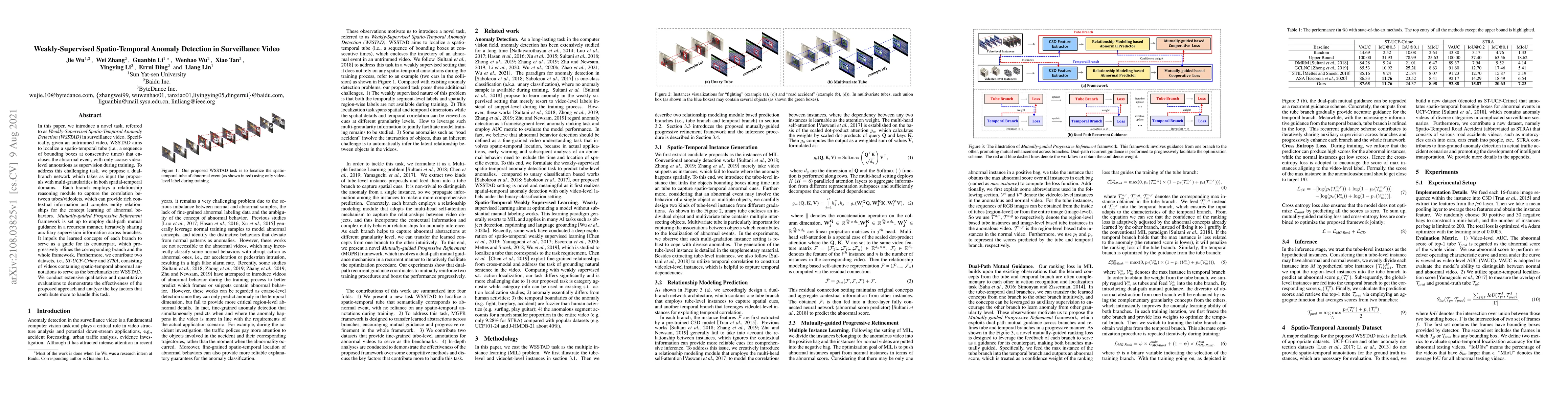 This paper proposes a novel weakly-supervised spatio-temporal anomaly detection method for surveillance videos using a dual-branch network with a relationship reasoning module and a mutually-guided refinement framework. The approach aims to localize abnormal events with minimal supervision and introduces two new datasets for benchmarking.