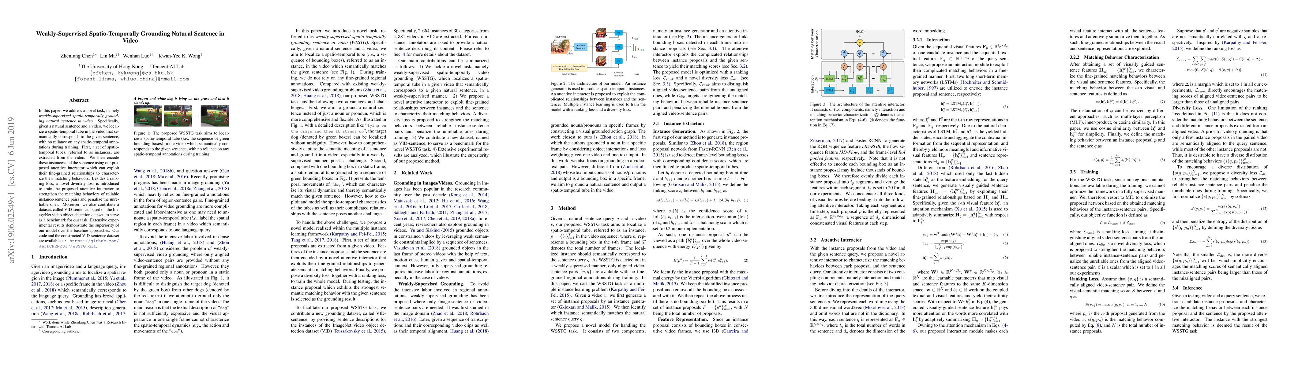 This paper introduces a weakly-supervised method for grounding natural sentences in video by localizing corresponding spatio-temporal tubes without training annotations. It employs an attentive interactor with a diversity loss to enhance matching and presents a new dataset, VID-sentence, for benchmarking the task.