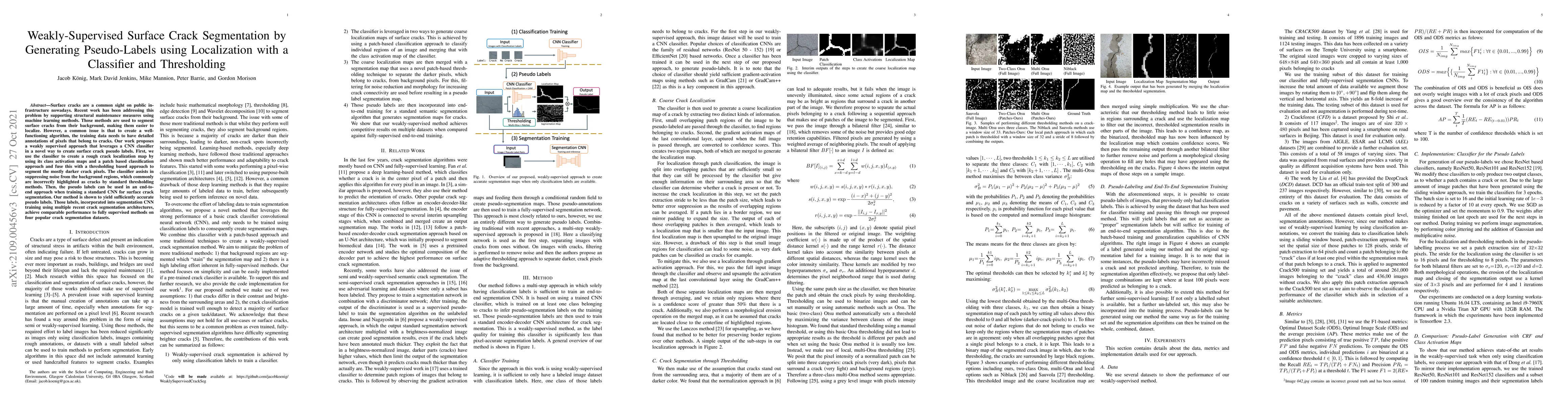 This research introduces a weakly-supervised method for segmenting surface cracks using a CNN classifier to generate pseudo-labels. The approach combines class activation maps and patch-based classification with thresholding to create accurate crack localization maps, effectively suppressing background noise. The generated pseudo-labels are then used to train a CNN for crack segmentation, achieving performance comparable to fully supervised methods.