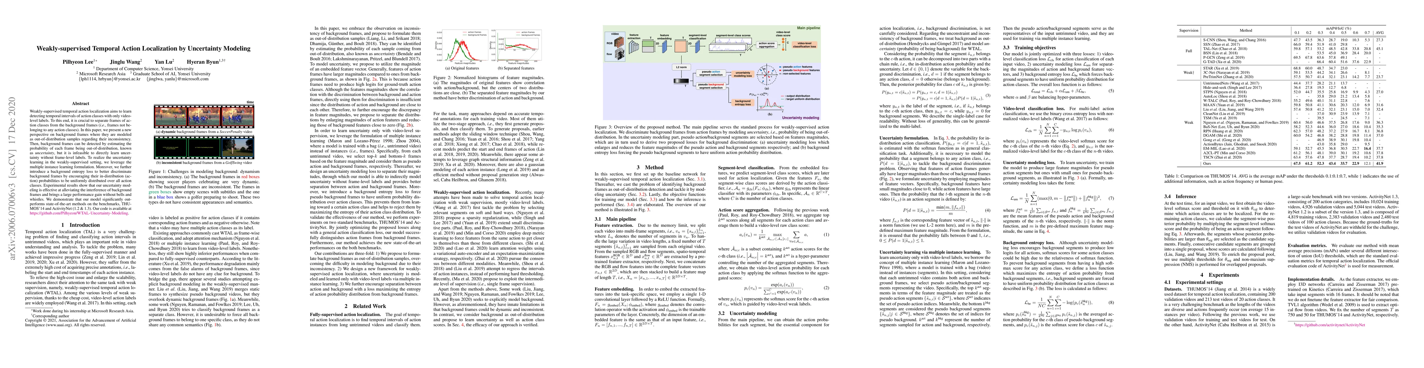 This paper proposes a method for weakly-supervised temporal action localization using uncertainty modeling, where background frames are treated as out-of-distribution samples. The model employs multiple instance learning and a background entropy loss to effectively detect and separate background frames, leading to significant performance improvements over state-of-the-art methods on THUMOS'14 and ActivityNet benchmarks.