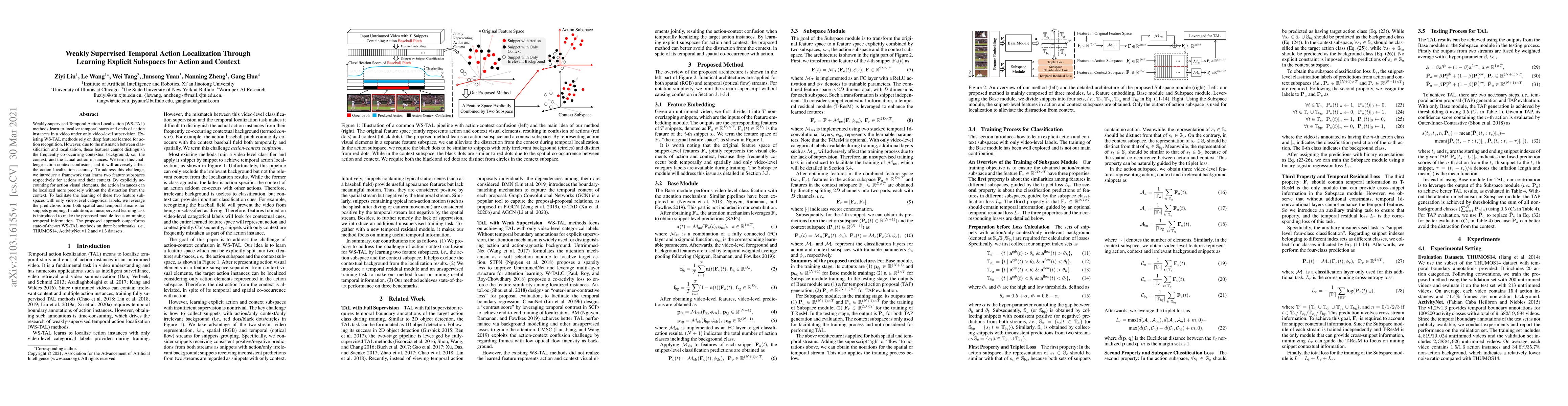 This paper proposes a framework for weakly-supervised temporal action localization that learns distinct feature subspaces for actions and their context to mitigate action-context confusion, achieving superior performance on THUMOS14, ActivityNet v1.2, and v1.3 benchmarks. The method leverages spatial and temporal predictions and an unsupervised learning task to enhance localization accuracy.
