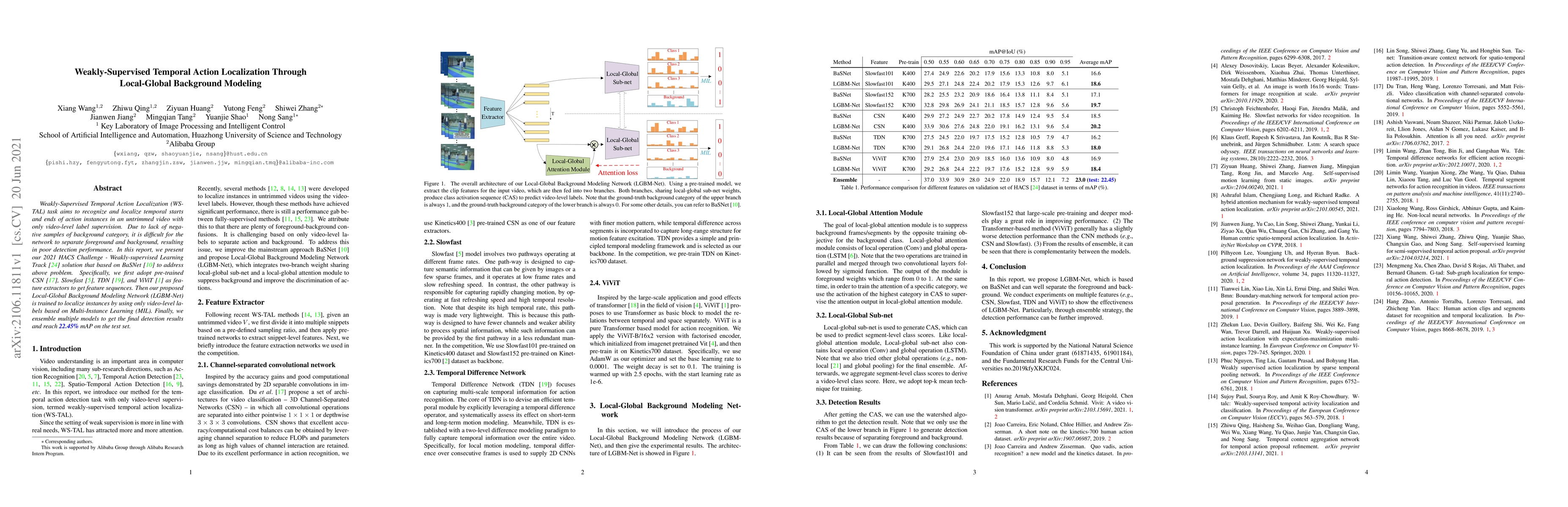 This paper proposes a solution for Weakly-Supervised Temporal Action Localization using Local-Global Background Modeling. It employs pre-trained feature extractors and introduces LGBM-Net to localize action instances using video-level labels, achieving 22.45% mAP on the test set.
