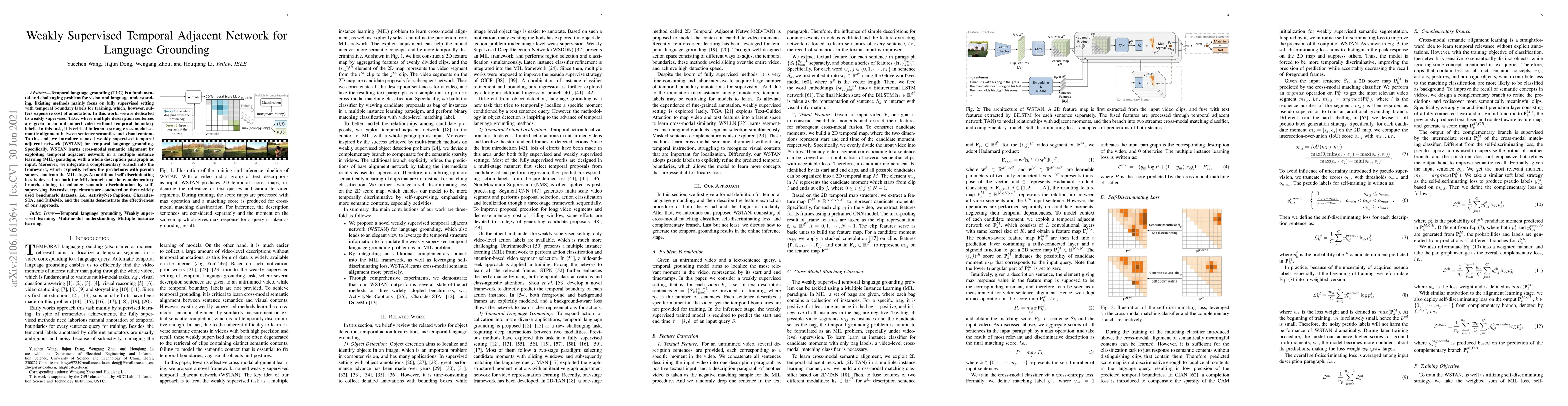 This paper proposes a weakly supervised temporal adjacent network (WSTAN) for temporal language grounding, addressing the challenge of aligning video segments with descriptive sentences without temporal boundary labels. WSTAN employs a multiple instance learning paradigm and a self-discriminating loss to enhance cross-modal semantic alignment and prediction refinement. Experiments on ActivityNet-Captions, Charades-STA, and DiDeMo show the method's effectiveness.