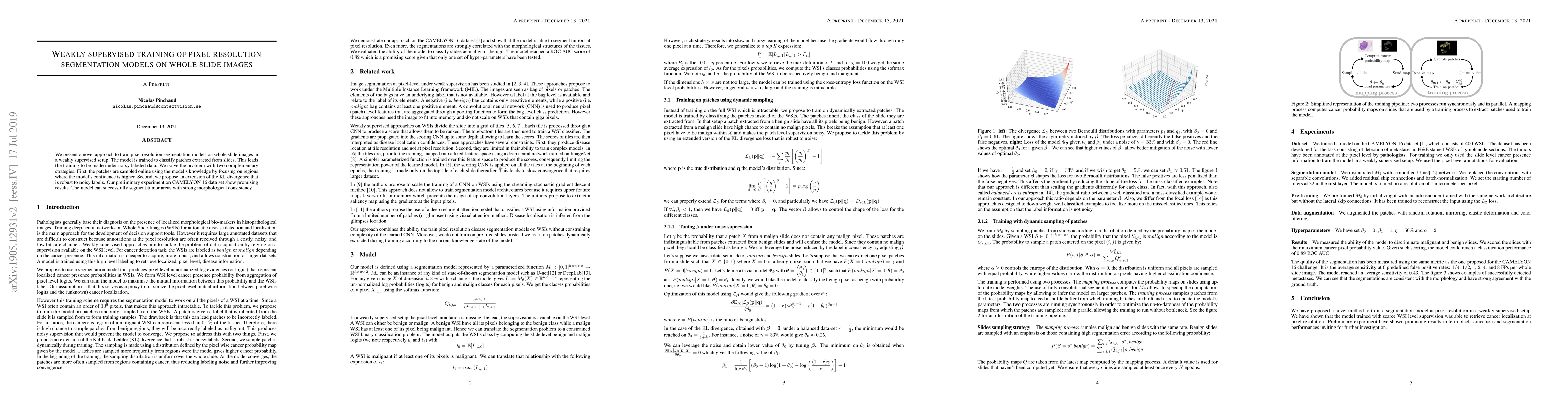 We present a novel approach to train pixel resolution segmentation models on whole slide images in a weakly supervised setup. The model is trained to classify patches extracted from slides. This leads the training to be made under noisy labeled data. We solve the problem with two complementary strategies. First, the patches are sampled online using the model's knowledge by focusing on regions where the model's confidence is higher. Second, we propose an extension of the KL divergence that is robust to noisy labels. Our preliminary experiment on CAMELYON 16 data set show promising results. The model can successfully segment tumor areas with strong morphological consistency.