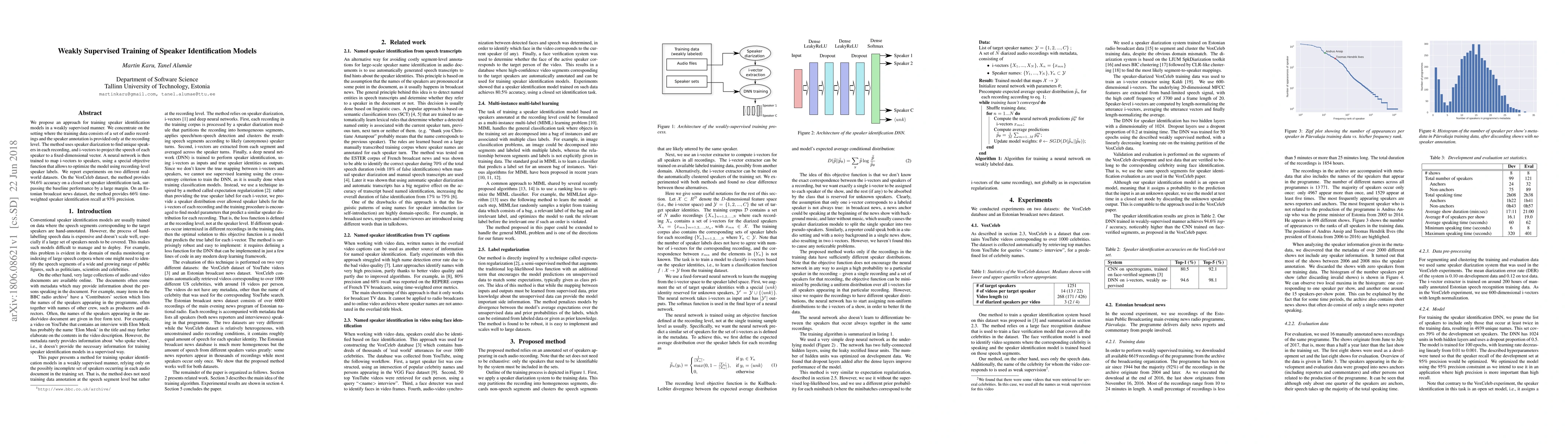This paper presents a weakly supervised method for training speaker identification models using only recording-level speaker labels. It employs speaker diarization and i-vectors, followed by a neural network trained with a special objective function, achieving high accuracy on VoxCeleb and good performance on an Estonian broadcast dataset.