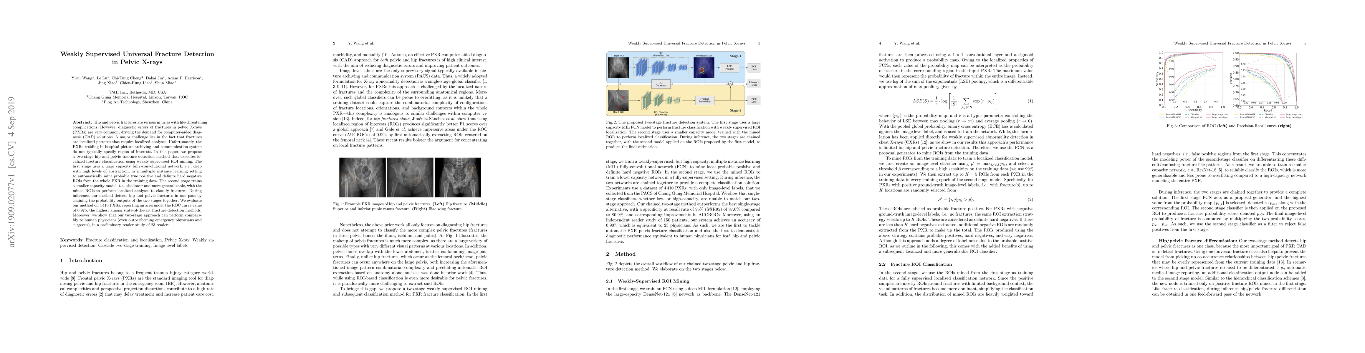 This paper proposes a two-stage method for detecting hip and pelvic fractures in pelvic X-rays using weakly supervised ROI mining. The first stage uses a deep fully-convolutional network for automatic ROI mining, while the second stage trains a smaller model on these ROIs for localized fracture classification. The method achieves a high ROC-AUC score of 0.975 and performs comparably to human physicians in a preliminary reader study.