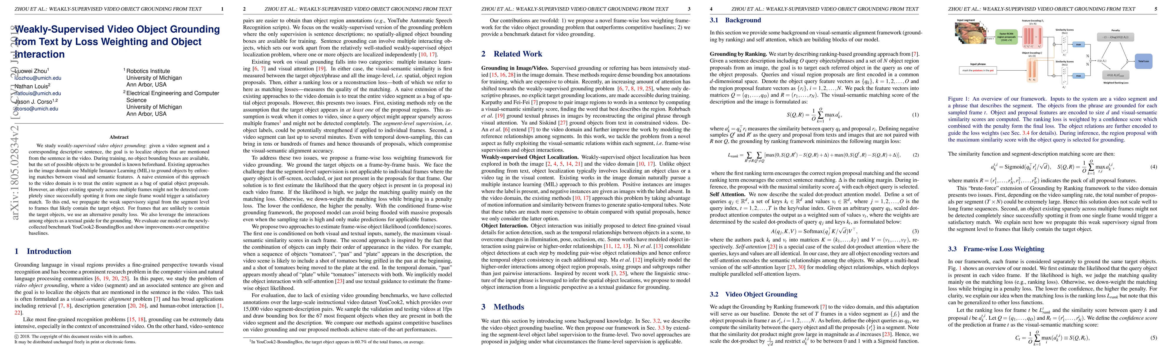 This paper proposes a method for weakly-supervised video object grounding from text by weighting losses and utilizing object interactions. It addresses the challenge of localizing objects mentioned in a descriptive sentence within a video segment without initial bounding boxes, improving upon existing Multiple Instance Learning approaches by propagating weak signals across frames and incorporating textual object interaction cues.