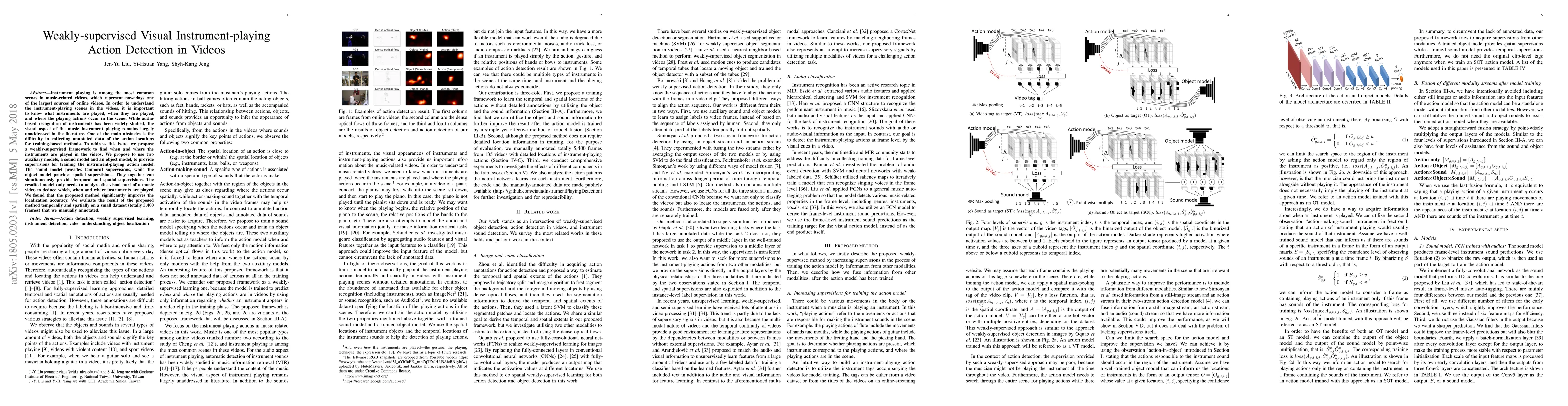 This paper proposes a weakly-supervised framework to detect visual instrument-playing actions in music videos using only visual information. It leverages auxiliary sound and object models to provide temporal and spatial supervisions, significantly improving localization accuracy on a manually annotated dataset.