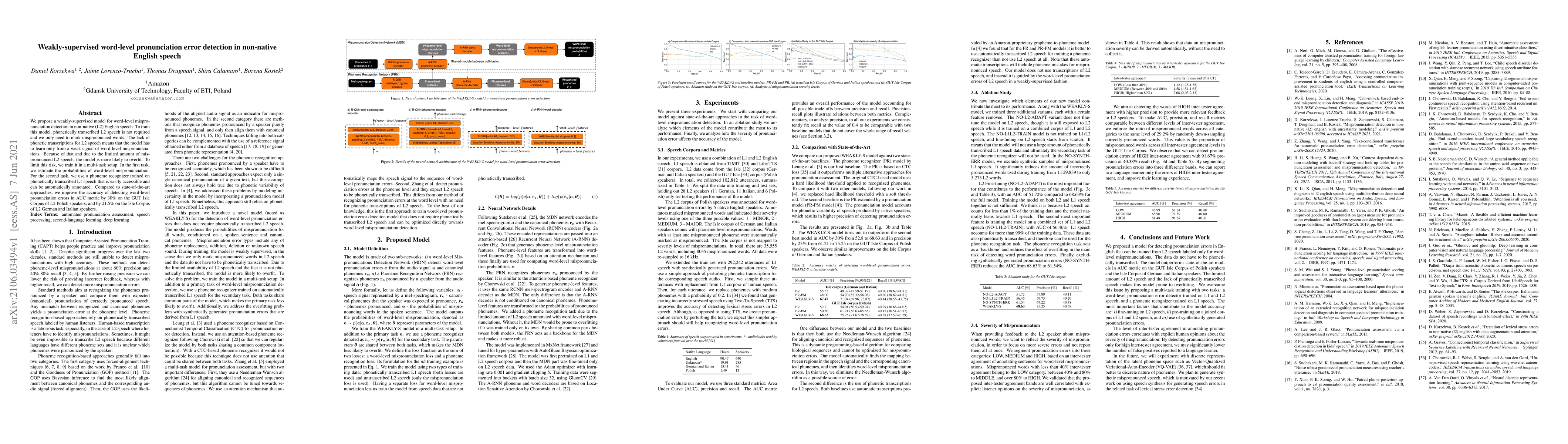 This paper introduces a weakly-supervised model for detecting word-level mispronunciations in non-native English speech without requiring phonetic transcriptions. The model is trained in a multi-task setup to mitigate overfitting, achieving a 30% improvement in AUC on L2 Polish speakers and a 21.5% improvement on L2 German and Italian speakers compared to existing methods.