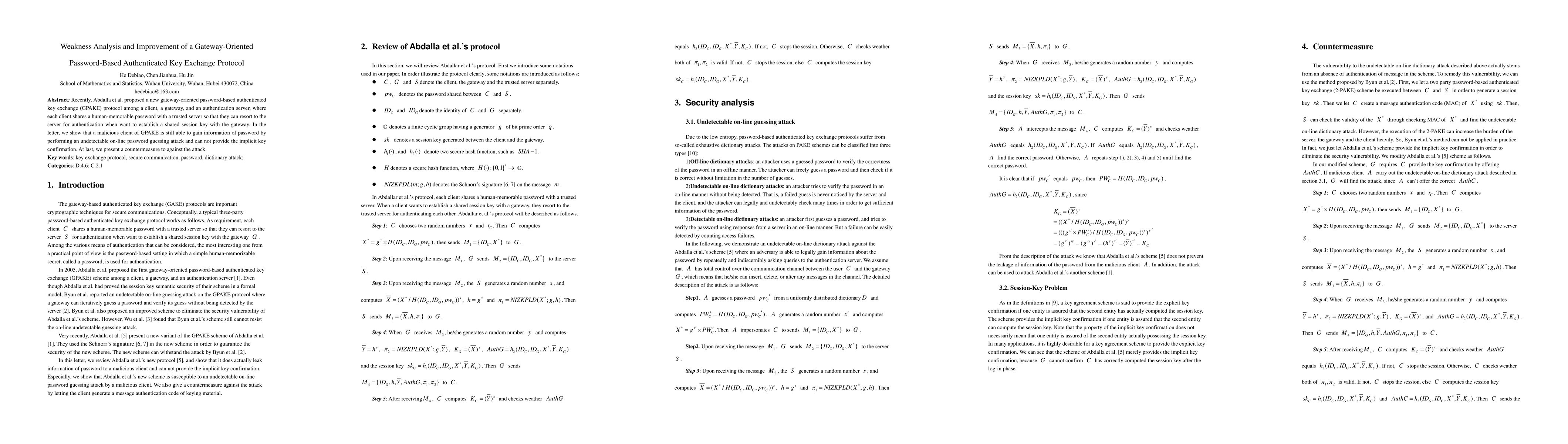 This paper identifies vulnerabilities in the GPAKE protocol, including an undetectable online password guessing attack by a malicious client and lack of implicit key confirmation. It proposes a countermeasure to mitigate these weaknesses.