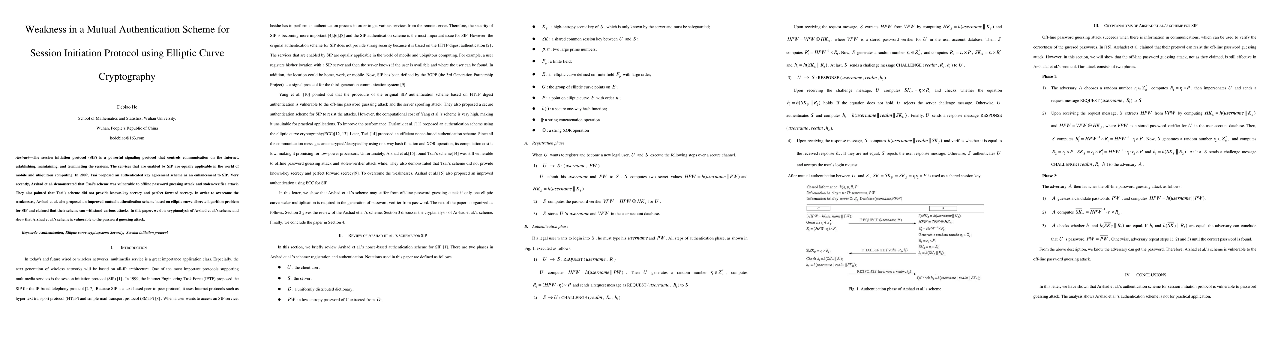 This paper critiques Arshad et al.'s proposed mutual authentication scheme for the Session Initiation Protocol (SIP) using elliptic curve cryptography, revealing it is vulnerable to password guessing attacks. The authors demonstrate that the scheme fails to provide robust security despite claims of improved protection.