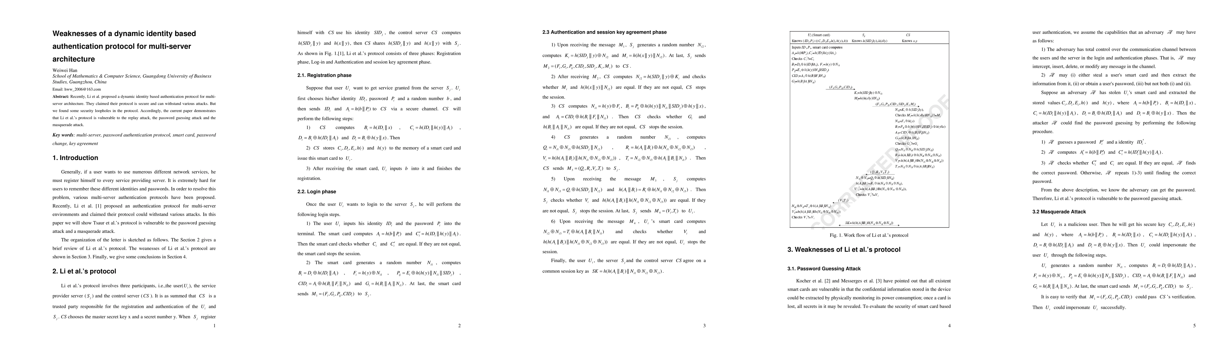 The paper presents a detailed analysis of Li et al.'s protocol, identifying specific vulnerabilities to replay, password guessing, and masquerade attacks, thereby contributing to the understanding of security weaknesses in dynamic identity-based authentication systems.