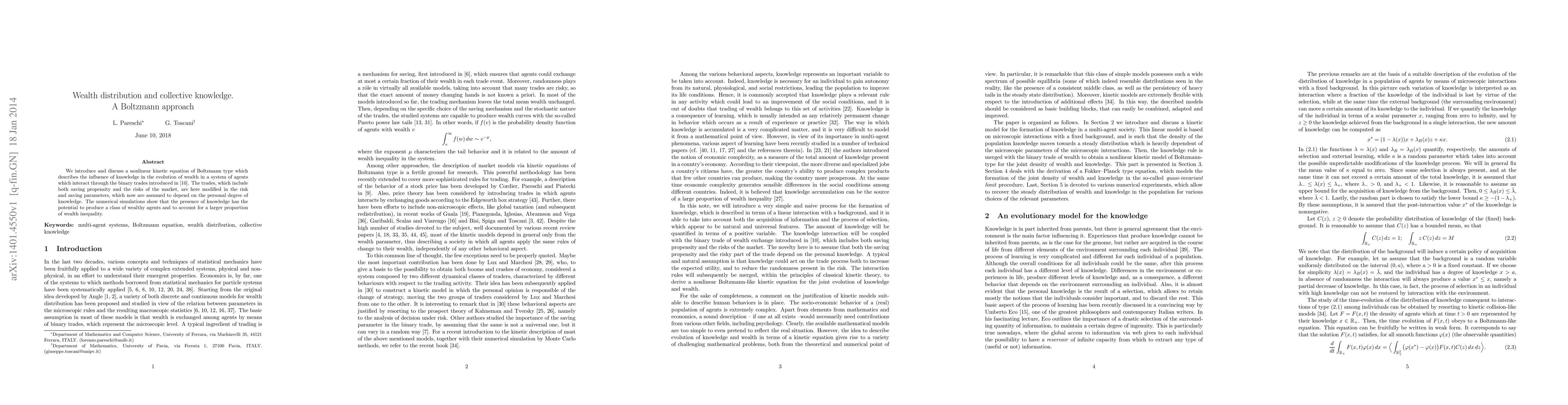 We introduce and discuss a nonlinear kinetic equation of Boltzmann type which describes the influence of knowledge in the evolution of wealth in a system of agents which interact through the binary trades introduced in Cordier, Pareschi, Toscani, J. Stat. Phys. 2005. The trades, which include both saving propensity and the risks of the market, are here modified in the risk and saving parameters, which now are assumed to depend on the personal degree of knowledge. The numerical simulations show that the presence of knowledge has the potential to produce a class of wealthy agents and to account for a larger proportion of wealth inequality.