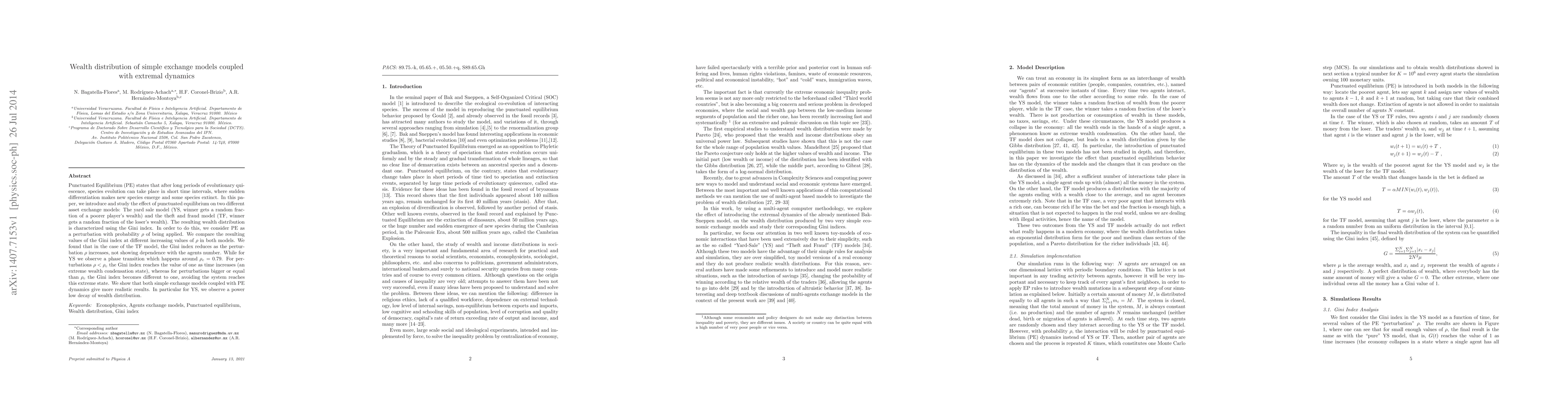 Punctuated Equilibrium (PE) states that after long periods of evolutionary quiescence, species evolution can take place in short time intervals, where sudden differentiation makes new species emerge and some species extinct. In this paper, we introduce and study the effect of punctuated equilibrium on two different asset exchange models: The yard sale model (YS, winner gets a random fraction of a poorer player's wealth) and the theft and fraud model (TF, winner gets a random fraction of the loser's wealth). The resulting wealth distribution is characterized using the Gini index. In order to do this, we consider PE as a perturbation with probability $\rho$ of being applied. We compare the resulting values of the Gini index at different increasing values of $\rho$ in both models. We found that in the case of the TF model, the Gini index reduces as the perturbation $\rho$ increases, not showing dependence with the agents number. While for YS we observe a phase transition which happens around $\rho_c=0.79$. For perturbations $\rho<\rho_c$ the Gini index reaches the value of one as time increases (an extreme wealth condensation state), whereas for perturbations bigger or equal than $\rho_c$ the Gini index becomes different to one, avoiding the system reaches this extreme state. We show that both simple exchange models coupled with PE dynamics give more realistic results. In particular for YS, we observe a power low decay of wealth distribution.