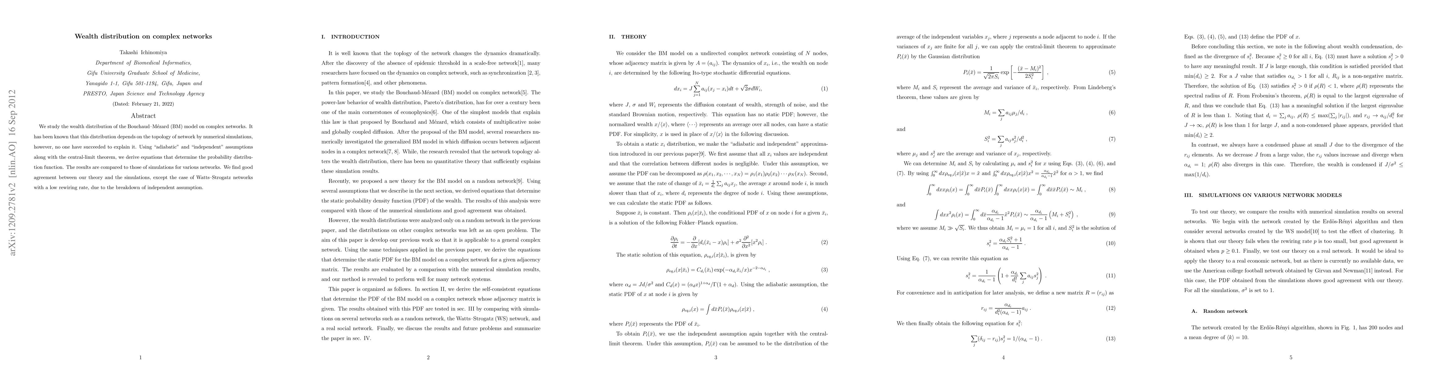 This paper derives theoretical equations to explain the wealth distribution in the Bouchaud-Mézard model on complex networks, using adiabatic and independent assumptions. The derived equations show good agreement with simulations across various networks, except for low rewiring rate Watts-Strogatz networks where the independent assumption fails.
