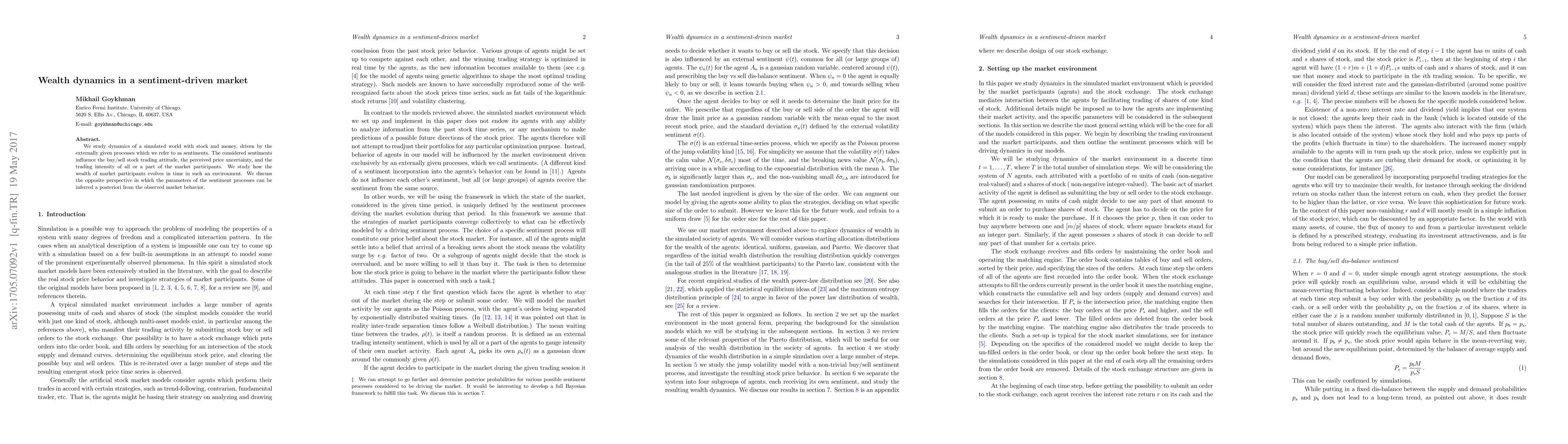 We study dynamics of a simulated world with stock and money, driven by the externally given processes which we refer to as sentiments. The considered sentiments influence the buy/sell stock trading attitude, the perceived price uncertainty, and the trading intensity of all or a part of the market participants. We study how the wealth of market participants evolves in time in such an environment. We discuss the opposite perspective in which the parameters of the sentiment processes can be inferred a posteriori from the observed market behavior.